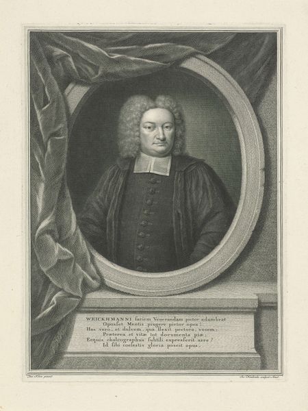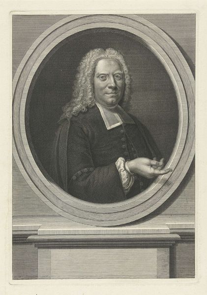 Curator: Welcome. We're standing before Pieter Tanjé's "Portrait of Johannes van Marle," an engraving completed in 1755. Note the detail rendered in the swirling, baroque frame. Editor: There’s something undeniably comforting in the gentle roundness of it all, from the frame to Van Marle himself. It’s a portrait exuding quiet authority and perhaps a hint of indulgence. Curator: Authority definitely plays a part. Consider the deliberate staging: the book held delicately in his hand suggests learnedness, his garments point towards religious stature. Tanjé’s engraving work here also points towards a specific culture of production—the artist as artisan, replicating likeness for wider consumption. Editor: Absolutely, and I wonder, did Van Marle have input? The hands are so delicately portrayed, almost like he's unsure of what to do with them, whilst everything else around him and his gaze conveys self-assurance. Curator: That could very well speak to the collaborative nature of portraiture. Tanjé’s skill resides in the layering of social expectations upon material possibilities. Engraving allowed for dissemination, creating a visual marker of social standing. It moves portraiture beyond a singular precious object. Editor: Right. Tanjé's technical mastery—the cross-hatching and fine lines used to create depth and texture—elevates it, transforming something that could be mere likeness into art. Each mark speaks to time and process. I appreciate seeing how material translates a persona. Curator: Exactly. Tanjé’s work invites us to reflect on how the subject’s identity and societal role were constructed and disseminated through these meticulous processes. Editor: So, a portrait of a person, embedded in the culture that both forms and seeks to immortalize him. I'm reminded that every mark holds history, making this artwork a map through time. Thanks for unraveling it.