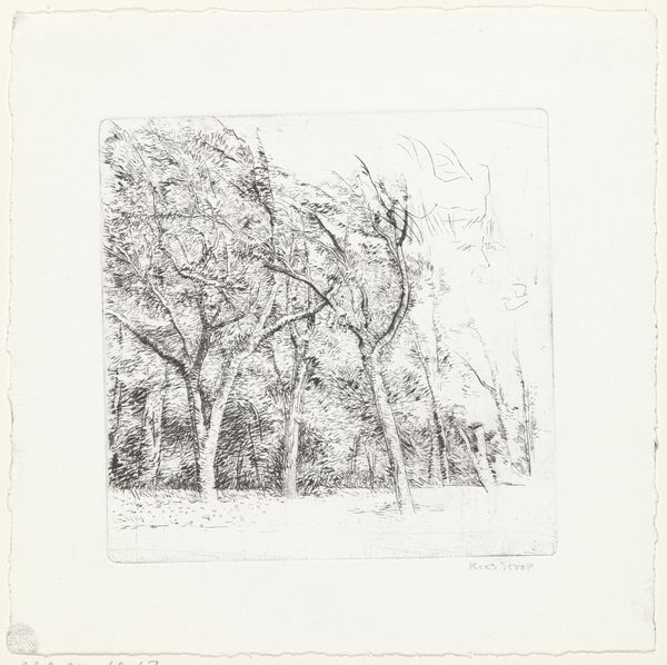 Curator: "Kale bomen," or "Cabbage Trees," is what Kees Stoop titled this piece. Its date is a little vague, sometime between 1944 and 1990. It's currently part of the Rijksmuseum's collection. He used etching to produce this serene landscape in monochrome. Editor: Immediately, I feel a certain starkness. The trees stand bare against what seems like a washed-out sky. There's an austerity, a simplicity, that is very appealing. A silence seems to permeate it. Curator: Stoop had a knack for distilling the essence of the Dutch landscape, didn’t he? After World War II, there was a lot of pressure to rebuild the country, literally and figuratively, but Stoop and other artists of his generation also felt it was necessary to honor what they had before the war and that which remained after the war. This landscape really embodies a commitment to what one already has. Editor: Yes, this is a very human-scaled landscape, with nothing particularly dramatic in sight. It feels ordinary but also deeply felt. And you can see the marks of the artist's hand, the subtle imperfections in the etching that somehow only emphasize its reality. There's a vulnerability here, too, don’t you think? Curator: Most definitely. The use of etching creates an interesting effect. Stoop's decision to render this scene in monochrome adds to the understated, pensive atmosphere. Etchings inherently provide an antique veneer due to their association with traditional printing methods. I wonder about that. Editor: I’m curious what inspired him to focus on this subject. The “Cabbage Trees”— it sounds whimsical and rustic. What do they stand for, those trees, in all their stripped-down vulnerability? Are they resilience incarnate or is it just about cabbage? Curator: I don't think we will ever be able to answer that exactly. I like how you put it—resilience incarnate. Stoop's legacy really resides in offering glimpses into his contemplation of nature and the effects of war and industrialization on his sense of what remains pastoral. It offers some very gentle reminders to modern-day consumers of art. Editor: Well, that gives me something to chew on. It's so subtle, so quietly powerful. Thanks for guiding us. Curator: The pleasure was all mine!