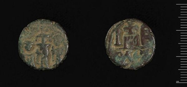 Editor: This is a Dodecanummium of Herakleios, Catana, by Abd-al-Malik of the Umayyads. The coin's material looks corroded and the imagery appears faded. What do you see in the arrangement of the lines and shapes etched on its surface? Curator: The deliberate placement of symbols on a circular plane offers a structured visual language. Note the stark contrast between the patinated metal and the shallow incisions. The circular form itself suggests wholeness, continuity, and perhaps even authority through its association with coinage. Editor: So, the coin's value isn't just monetary but also symbolic? Curator: Precisely. Consider how the lines and shapes interplay, creating a visual rhythm that aims to convey meaning beyond its face value. Understanding this formal structure is key to unlocking its artistic significance. Editor: I never thought of a coin as something to read in that way. Thanks!
