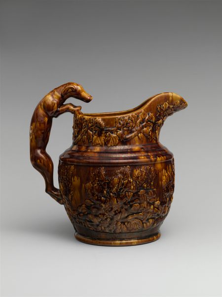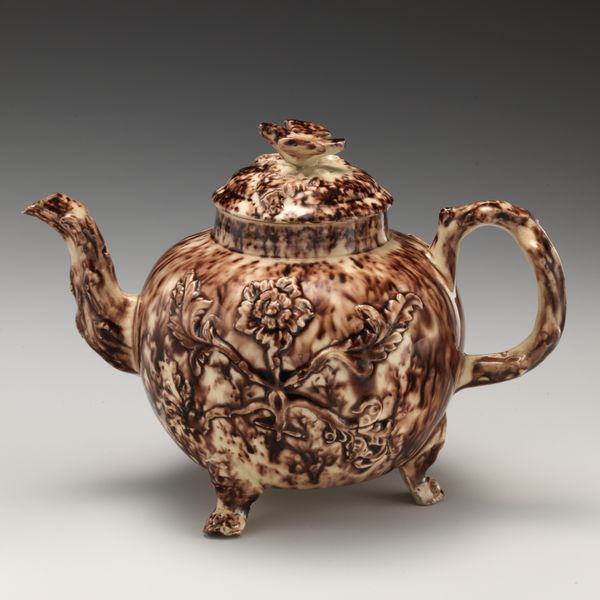 Curator: Standing before us is an intriguing teapot crafted by John Astbury between 1740 and 1750. Currently residing at the Metropolitan Museum of Art, this piece exemplifies Baroque decorative arts, constructed from earthenware and showcasing sculptural qualities. Editor: It’s surprisingly menacing, isn’t it? The rich brown colour combined with the beastly handle and spout gives it this strange sense of dark elegance, almost gothic, though I suppose Baroque leans in that direction generally. Curator: The contrasting matte glaze of the reddish-brown body against the glossy relief decorations certainly generates visual tension. We observe a heraldic shield front and center, flanked by what appears to be a lion rampant and another perhaps a Pegasus motif set above floral and foliate appliqués. The dragon handle and bird-shaped knob create striking animalistic focal points as well. Editor: Absolutely. And I'm drawn to the juxtaposition of refinement and raw power— the dainty vessel meant for brewing and pouring tea, adorned with creatures that suggest strength. It almost feels like a secret language about social standing or even political leanings communicated through something as ordinary as tea service. What's brewing beneath the surface, so to speak? Curator: Indeed. The symmetry is pronounced, yet it doesn't overwhelm the slightly whimsical character imparted by those sculptural additions. Astbury appears to be making a very precise, sophisticated statement while leaving space for humor. Editor: You know, it makes me wonder about the person who first owned this teapot. Were they aware of these layered meanings, or did they simply appreciate its craftsmanship? What stories did it witness around the table, tucked away inside it's ceramic core? It would be such fun to imagine it’s secrets! Curator: An apt point, especially when considering that a vessel designed for warmth and sharing would be also subtly signaling one's status or affiliations. This particular teapot invites us to ponder these multifaceted aspects of eighteenth-century material culture. Editor: It's a powerful thing, isn't it, to transform clay and pigment into something that speaks volumes centuries later? A silent yet resonant commentary that links past, present, and those cups of tea to come!