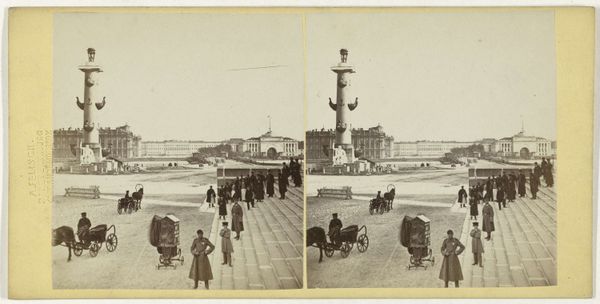Editor: This is "Piazza del Popolo, met obelisk en de Porta del Popolo" by Ernest Eléonor Pierre Lamy, created between 1861 and 1878. It's a photograph, capturing a cityscape in Rome. The obelisk immediately grabs your attention. How would you approach analyzing this photograph from an art historical perspective? Curator: Let's begin by considering the composition itself. Note how Lamy frames the Piazza del Popolo. The verticality of the obelisk is echoed by the Porta del Popolo and juxtaposed against the horizontality of the buildings. What effect does this structure create for you, and how does the interplay of light and shadow influence your reading? Editor: The light makes it feel very flat and documentary, though the dark doorway adds some depth. But the way the obelisk dominates feels deliberate. Curator: Precisely. Now consider the tonal range, or lack thereof, as you observed, and the overall clarity, the formal qualities, they evoke a sense of objective recording. Lamy appears concerned with capturing the architecture with minimal intervention. This relates directly to its function, and photography's function generally. Can you expand on that? Editor: Are you suggesting the choice of photography emphasizes its goal to mirror truth and objectivity? While painting is interpreted, photography’s effect stems from its seemingly scientific registration? Curator: Precisely. One must appreciate the nuances of this photograph not only as documentation, but for the careful staging of reality—the angle, the framing, the balance between shadow and light. It's not a purely objective record but a constructed visual statement that relies heavily on formal elements to generate meaning. Editor: I now see it as less of a plain documentary image and more of a calculated commentary through careful design and technique. I appreciate the explanation, focusing our view on how to decipher meaning and appreciate nuances of formal aspects to better grasp and discuss its intention.