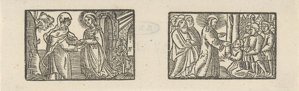 Curator: This pen and ink drawing, made before 1482, is titled "Fourth Prophet and a Prophetess." The artist is currently unknown. Editor: It strikes me as a rather austere composition. The use of stark black ink against the paper creates a mood of serious contemplation, perhaps even severity. The rigid, perpendicular lines seem to emphasize this somber tone. Curator: I see that. Look at how the artist rendered the figures themselves. The prophet and prophetess are each presented in an architectural frame, almost like icons, reinforcing their roles as figures of religious significance, channeling a cultural memory. Each figure is depicted holding a scroll, likely containing their prophecies or religious teachings. This act of presenting the word emphasizes the enduring legacy of religious figures. Editor: The stark linearity and hatching create visual textures and tonal variations. I’m especially intrigued by the composition. It is bisected; each figure exists within a tightly rendered rectilinear framework, and yet this structural similarity is punctuated by the individual characteristics: the masculine angularity, bearded face and garb of the Prophet countered by the flowing drapery and veiled head of the Prophetess. It draws the viewer into a comparative analysis of the figures and the role and symbolism inherent in gender. Curator: Absolutely, that contrast carries through. The prophet with his hands clasped around a book signifies established wisdom, where as the prophetess clutches a long scroll as if unfurling a future revelation. It reflects prevailing cultural concepts about gendered religious roles in medieval society and how the two fulfill spiritual purposes in complementary ways. Editor: I agree; the use of graphic simplicity allows the ideas to be clearly understood without embellishment or unnecessary flourishes. The reduction to such pure formal devices helps to emphasize content through semiotic relationships between lines, shapes and symbols. Curator: It is intriguing to consider the historical interpretations this work would inspire. The artist captures enduring narratives within an essential composition; it evokes powerful memories. Editor: An exceptional combination of stylistic precision and impactful simplicity of form, and of cultural expression.
