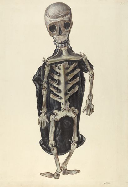 Daniel Huntington's Rear View of a Skeleton is a drawing rendered in graphite on paper and mounted on board. The artist used the graphite to create a monochromatic drawing of a human skeleton, carefully articulating each bone, its texture and form. The use of graphite allows for delicate shading and detailing, capturing the play of light and shadow on the skeletal structure. As a readily available and relatively inexpensive material, graphite democratized drawing, making it accessible for both artistic and scientific illustration. Huntington skillfully depicts the human anatomy, emphasizing the structural integrity of the skeletal system. The artist’s interest in the human form connects this work to scientific inquiry, reflecting the growing intersection of art and science during the 19th century. This use of drawing, with the inherent need for careful observation and accurate rendering, speaks to a broader cultural context where artists explored different representational strategies. Ultimately, understanding the social context of the artist's materials and modes of production can help us see beyond traditional distinctions between art and craft, and towards a richer understanding of artistic expression.