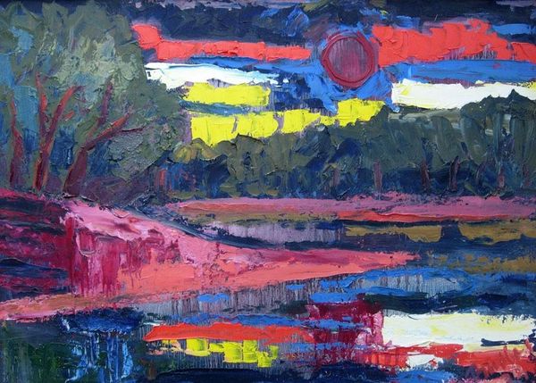 Endre Bartos painted "Sugovica River in Mourning" with oils, and you can really feel that process in the finished image. It's less about a photorealistic view of the river, and more about the act of painting itself. The texture is amazing – thick, almost sculptural in places. I keep coming back to the way the black paint of the trees sits so heavily on the canvas. There's this real tension between the dark, solid forms of the trees and the fluid, dreamlike landscape around them. The surprising choice of pinks and purples against the fiery oranges creates this incredible emotional space, like a memory tinged with sadness. It reminds me of Milton Avery's landscapes, that same simplification of form and focus on feeling over detail, but with a uniquely Eastern European sensibility. It's a painting that stays with you, not because of what it shows, but how it makes you feel.