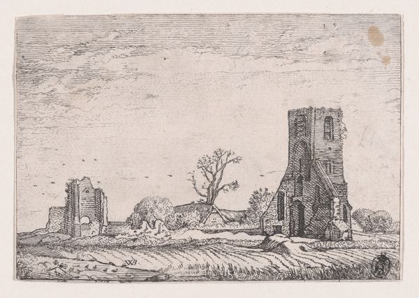 Curator: This is "Dorpsgezicht met kerktoren," or "Village View with Church Tower," an etching by Jan Gerard Smits, created in 1873. Editor: It's so delicate! The light feels captured by the etched lines; it has a melancholic stillness despite the windy tree on the left. You can almost feel the cold of the Northern Renaissance masters influencing the realism. Curator: It really encapsulates a specific kind of Dutch village archetype. Notice how the towering church acts not just as a geographic marker but a clear visual and symbolic anchor to the whole community. What does the spire evoke for you? Editor: The fact that the church and other buildings share equal weight indicates a strong, classless society, while that steeple has also, undoubtedly, been crafted by many unseen hands across generations—a tangible display of social effort through the making of material things. I wonder, what kind of presses were available for such detailed work? And how did it influence its popularity and spread amongst local society? Curator: The cultural resonance surely relies on both access and symbolic centrality. You are so right that one cannot overlook the socio-economic implications related to printmaking: its relative ease of dissemination is one of its most distinguishing qualities, and it could reach people unable to afford paintings at that time, making potent messages far more accessible. And with such potent symbolism of the Church as a symbol of refuge and communal faith. Editor: Right. I find myself appreciating more the interplay of visibility and craft, and understanding how it mirrors and strengthens existing cultural belief and socio-economic conditions. A testament to art production entwined with broader community experience. Curator: Yes, and its effect then lingers, as that scene continues to hold echoes of village identity for us, even today.