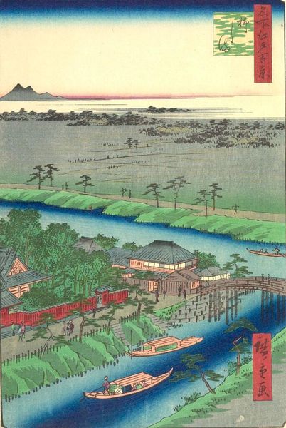 Editor: This is Utagawa Hiroshige's "Nihonbashi," created in 1855. It's a woodblock print. The scene feels very dynamic; it depicts a bustling bridge and waterfront. What are your initial thoughts? Curator: Immediately, I'm drawn to the materiality. Look at the evidence of labor in each precise line of the woodblock print. The grain of the wood itself likely influenced Hiroshige’s carving decisions, don’t you think? Consider the immense labour involved in producing the blocks themselves, not just by Hiroshige, but by teams of skilled artisans. Editor: I hadn’t considered the physical process that deeply, but now that you mention it, the level of detail is extraordinary. The buildings, the boats, and especially the bridge look like they demanded painstaking work. Curator: Precisely. Also think about how the urban landscape depicted reflects specific socio-economic factors. This bridge facilitated the distribution of goods and the flow of people. So, the woodblock is both a product and a mirror of commerce. What kind of materials do you imagine are being traded or consumed based on the evidence here? Editor: Hmm, I see figures carrying things... possibly textiles? It’s all packed quite densely, though. Curator: And how does the repetition of figures, bridge supports, and even the strokes used to depict water, inform our understanding of the repetitive labor present at the time? Even the consumption of prints such as this were bound up with merchant activities. Editor: It reframes how I look at the image; I initially focused on its beauty, but now I’m thinking about the production, labour, and distribution it represents. Thanks, this has helped me to appreciate how intertwined the art is with the economy around it. Curator: Indeed! The 'high art' here is inextricably bound up with daily economic survival.