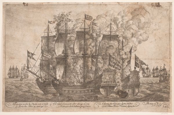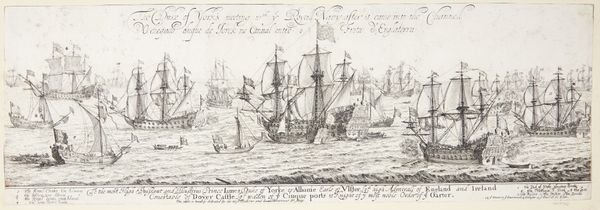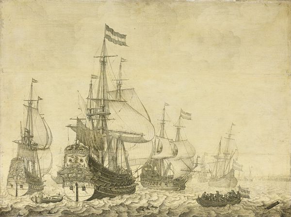 Editor: Here we have "Council of War aboard "The Seven Provinces", the Flagship of Michiel Adriaensz de Ruyter, 10 June 1666, preceding the Four Days' Battle: episode from the Second Anglo-Dutch War", an etching by Willem van de Velde the Elder, dating from between 1666 and 1693. It's currently held at the Rijksmuseum. What strikes me immediately is the artist’s capacity for meticulous detail given the scale of the scene. I’m curious, what visual aspects stand out to you in this work? Curator: The engraving immediately showcases a highly organized and rigorous depiction of maritime elements. Notice the articulation of line, its sheer precision which delimits the composition. Observe the careful delineation between the textures: the taut sails versus the roiling sea, achieved through sophisticated deployment of hatching and cross-hatching. This technique, intrinsic to printmaking, generates a compelling visual dichotomy within the artwork. Do you note how van de Velde uses tonal gradations to generate a three-dimensional effect? Editor: I do see how the density of lines varies to create depth and shadow. But does this formalist approach perhaps neglect the narrative, the depiction of the war council itself? Isn’t the subject matter important? Curator: Subject matter exists of course, yet formalism prioritizes *how* that subject is rendered visible. Ask yourself about the artist’s choices regarding composition: the placement of the flagship, the arrangement of the figures… These are formal decisions contributing to the viewer’s experience. Further consideration ought to be given to how the materiality and the monochromatic palette accentuate these formal choices. Editor: So, by focusing on these elements like line, tone, and composition, we can grasp the artist’s intention more clearly, even beyond the historical narrative. That’s fascinating, and a good reminder to examine those building blocks in any work we encounter. Curator: Precisely. Approaching art through its inherent structure often provides a new vantage for experiencing the image.