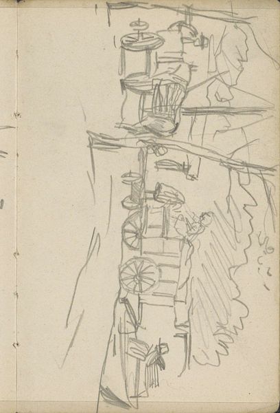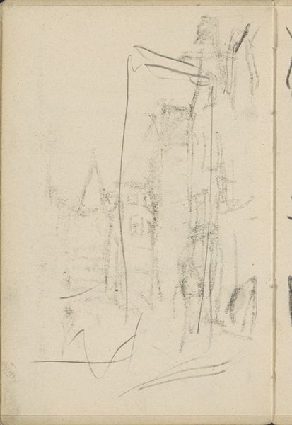 Editor: So, this is George Hendrik Breitner's "Gezicht op de Prins Hendrikkade te Amsterdam," a pencil and chalk drawing from around 1903. It's a quick sketch, and it feels almost ephemeral. What strikes you most about this piece? Curator: For me, it’s the immediacy and the raw nature of the materials themselves. Look at the way the pencil scratches at the paper. This isn’t about illusionism; it’s about the physical act of drawing, the labor involved in capturing a fleeting moment. Consider how industrialization was transforming Amsterdam at this time. Breitner isn't depicting a pristine cityscape. Editor: That makes sense. It's less about the specific buildings and more about the process of rendering the scene, right? Almost like he’s documenting his own labor? Curator: Precisely! And notice the toned paper. Why that choice? What does it offer in terms of materiality that plain white paper doesn’t? Think about the cost of the material and its availability. Editor: Maybe the toned paper creates a sense of depth more efficiently, with fewer pencil strokes, thus saving the artist labor or maybe it was simply a more economical choice? It highlights the contrast? Curator: Possibly. Now, if Breitner were alive today, would he be using digital tools? How would that alter our understanding of artistic skill and effort? What does "labor" even mean in the digital art world? Editor: That’s a good point. The ease of digital creation could change how we value the handmade quality seen here. I never really thought about how the cost or availability of drawing materials might shape the artwork. Curator: Exactly. This sketch is less a window onto Amsterdam, more a document of artistic process in a rapidly changing, industrializing world. Editor: It really makes you appreciate the tactile nature of the artwork, the physical effort of creating it. Thanks! Curator: My pleasure. It's all about digging beneath the surface and seeing art as a product of its material conditions.