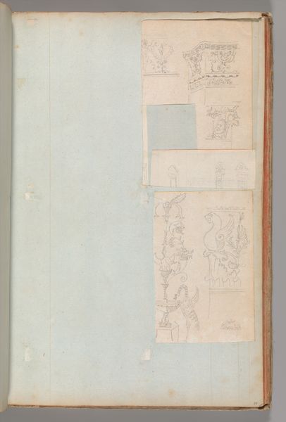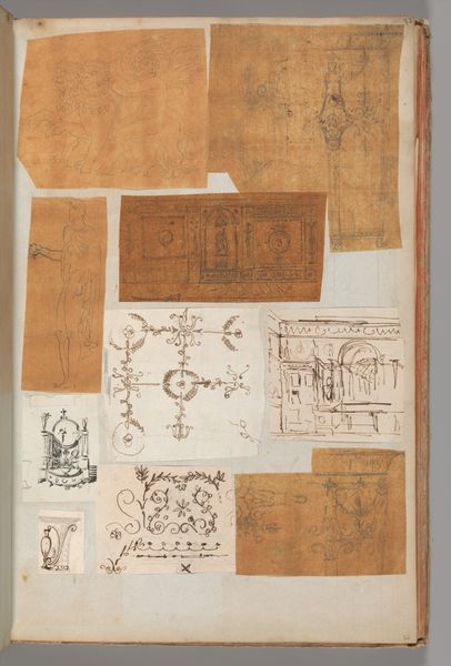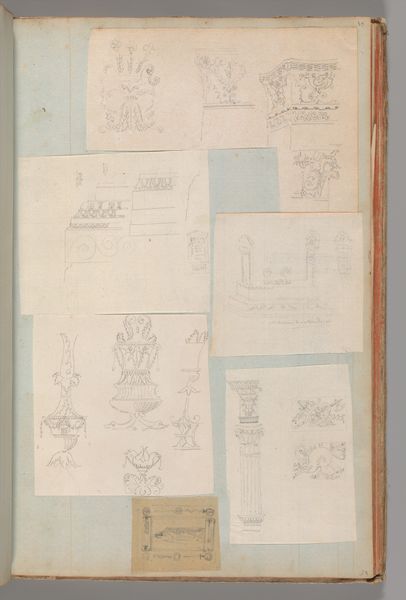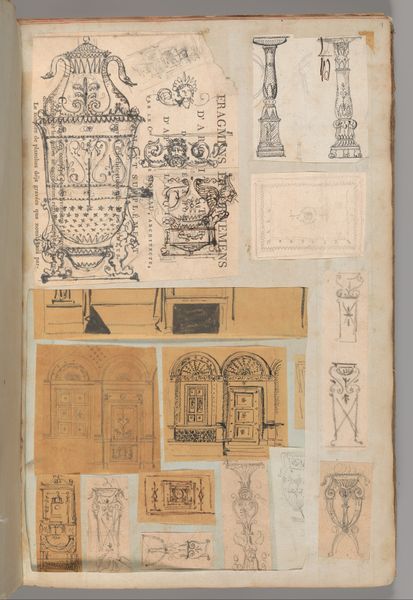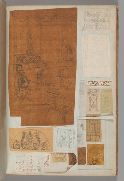 Curator: This is a page from a scrapbook by Charles Percier, dating from around 1795 to 1805. It combines drawings and prints, showcasing architecture, interiors, furniture, and other design elements. Editor: It's fascinating how these seemingly disparate images co-exist on one page. The overall effect is one of fragmented memory. Curator: Percier’s methodology is interesting here. Notice the variety of medium: pencil drawings adjacent to prints. This juxtaposition disrupts any singular formal reading. How does this contrast of the copy versus the unique mark influence our reading? Editor: The recurring motifs suggest a clear thematic interest in power and prestige. Look at the recurring winged lions, ancient rulers, even the furniture itself suggests status and control. It almost reads like an inventory of symbolic assets. Curator: Agreed. Let’s think about that. The loose, sketchy nature of the drawing style is certainly interesting when considering power. The quick strokes and unrefined forms contribute to an immediacy that somewhat contrasts with the traditionally formal symbols depicted. Editor: It reminds me of a mood board—gathering of imagery imbued with deep, culturally specific symbolism—and as we know, this historical period was fascinated with Neoclassical grandeur. What seems personal and spontaneous may belie deep-seated values in design. Curator: This is where things get interesting. It becomes an exploration of image deconstruction; how symbols transform between personal imagination and grand public expression. Editor: Exactly. It gives a glimpse into how historical and symbolic weight is transformed by an artist’s imagination—it makes history tangible and emotionally accessible. Curator: Thinking of our own time, digital environments encourage endless visual collages of fragments, creating unique recombinations and juxtapositions that blur meanings. This scrapbook foreshadows the effects of that kind of imagery overload and questions notions of originality in design. Editor: Ultimately, it feels very intimate—a record of inspirations, artistic development, a place where visual traditions become tools for imagining new possibilities.