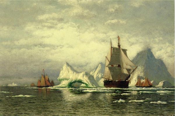 Curator: Looking at William Bradford's 1883 oil painting, "Icebergs", I immediately feel the cold. Editor: It really has that arctic bite, doesn't it? Almost makes you want to reach for a sweater! There's something about the light reflecting off the ice that creates a specific mood. A serene, slightly melancholy, sort of stillness. Curator: Indeed. It’s crucial to remember the historical context here. Bradford was deeply invested in representing the Arctic voyages. These weren't simply scenic landscapes; they were depictions of an area undergoing rapid transformation due to human activity. We are viewing more than just 'pretty' icebergs; it's about colonial expansion, resource extraction, and indigenous erasure. Editor: Wow, okay, that's deep. I mean, I was just thinking how the painting almost flattens the scale. The boats look tiny against those massive ice formations, which, makes one reflect, at how small we all are. Curator: That sense of insignificance in the face of nature absolutely resonates within Romanticism, but in our present era, where the melting ice caps contribute significantly to the rise of sea levels that endanger many nations, it makes you reconsider ideas of our planet’s fragility and precarity. How the natural world isn't some separate "landscape", it's everything. Editor: Exactly! And there's the little dabs of color too – like those touches of rusty orange in the sails, the little hint of pale emerald hugging the iceberg, reflecting in the water – they’re beautiful. The ice glows, almost ethereal, as a soft halo that contrasts sharply to the darker rocky terrain and small structures ashore. This creates an interesting effect; on the one hand nature prevails and seems overpowering and, on the other, humans keep settling it, making their mark, staking their claim to it, irrespective of the looming giant icebergs and freezing waters. Curator: And let's not forget the impact of artistic choices here. Bradford’s detailed, almost photograph-like quality speaks directly to a cultural obsession with ‘truth’ and ‘objectivity’ that also ignores the often-violent impact of the so-called discoveries during those Arctic voyages. His rendering aligns directly with scientific modes of representing those Arctic zones. Editor: True! I think about how things once were. As a last note I think this canvas, even with it´s historical load, helps me to think about where we are today. Maybe an uncomfortable, chilly little mirror to our times?