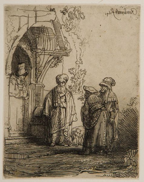 Editor: This is Rembrandt van Rijn’s etching, "Joseph's Coat Brought to Jacob." The scene is so emotionally charged, and Jacob's grief is palpable. What strikes you most about the imagery in this piece? Curator: Note how Rembrandt uses the visual language of light and shadow to amplify the emotional weight. The tattered coat, a symbol of lost innocence and betrayal, becomes a potent icon of familial trauma. What does the positioning of the figures suggest to you? Editor: It's like each person is trapped in their own grief. I had not considered the coat as such an important symbol until now. Curator: Precisely. By depicting this biblical story through these symbols, Rembrandt taps into universal themes of loss and deception that echo through cultural memory. Editor: I see now how Rembrandt used potent iconography to deepen the narrative's emotional impact. Curator: Indeed, the visual symbols resonate profoundly across time, embodying enduring psychological truths.