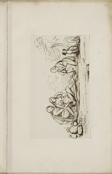 Curator: Before us, we have a drawing by Karl Joseph Aloys Agricola from 1812, titled "Vrouw, mogelijk de Liefdadigheid, ondersteunt een oude man," or "Woman, possibly Charity, supporting an old man". Editor: The subdued graphite and pen work create a poignant scene. The delicate strokes emphasize fragility, the man leaning heavily on his staff, the woman composed. It’s very subtle and subdued—I’m struck by that delicacy. Curator: Agricola worked during a period where Neoclassicism heavily influenced artistic expression. He creates here an allegorical piece, tapping into the theme of charity, a very public concern within the rising social and political contexts of Europe at this time. What I see here is not only fine draftsmanship, but a deliberate invocation of classical virtue presented to a contemporary audience. Editor: Indeed. Thinking about materiality, what sort of paper was available? How did Agricola’s social status as an artist influence the materials at his disposal and how his work was received by a burgeoning art market and Academy? His method utilizes delicate strokes. This, combined with the grayscale drawing, certainly underscores a more traditional method in both his use of figuration and tools available for artists during the period. Curator: Absolutely. Consider also how academies, like those Agricola engaged with, prescribed approaches and styles, reinforcing classical ideals within the social and cultural fabric. This wasn’t just an artistic choice; it reflected a whole system of patronage and artistic training, very much dictating acceptable narratives for public consumption. Editor: True. And it brings us back to labor too, the training Agricola invested into honing a particular aesthetic and the value of artisanal practice at the time—it's a quiet, contemplative piece reflecting that social context. Curator: In viewing this drawing today, its legacy is still significant in how artistic skill was perceived within institutional art settings during that time. The visual representation of public values, disseminated by rising Academies, reminds us about how the politics of imagery function. Editor: Absolutely. And understanding this artistic labour reminds us to always look beyond what initially meets our eye.