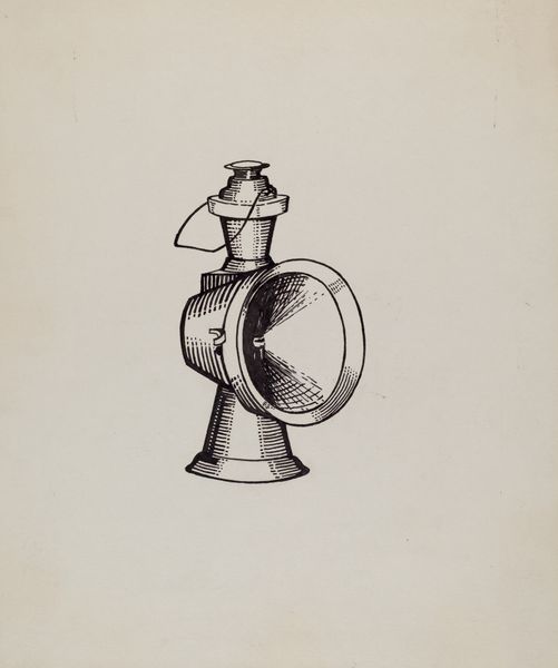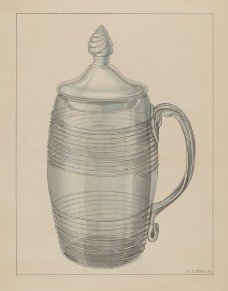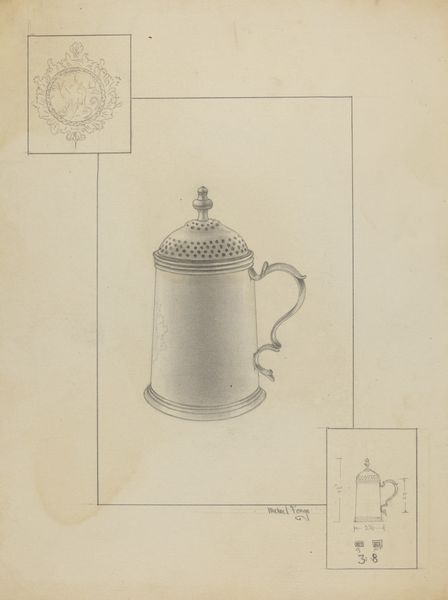 Editor: Here we have Lawrence Flynn's "Silver Tankard," created around 1936. It's a pencil drawing and has an almost architectural feel, really emphasizing the geometric structure. What do you see in this piece? Curator: For me, it screams "making." Look at the careful pencil work. It isn't just depicting a silver object; it is about the labor involved in design, the rendering process itself, even perhaps hinting at the potential mass production that such a design might lead to. Does the drawing style indicate preparation for fabrication in your view? Editor: Absolutely! It's like a blueprint, each line serving a specific purpose for the craftsman. The silver itself is only potential, the real thing is this design. I also notice a tiny geometric construction in the top and bottom right hand corners. Curator: Yes, exactly! The geometric constructions on the right and details feel so critical. I find myself thinking about the social context, the Art Deco influence in design and even questioning the consumption this drawing anticipates. Are we celebrating craft, or commerce, or both? What details seem the most telling to you about this? Editor: I hadn’t considered it in those terms, but now I’m drawn to the handle's ornamentation, the small heraldic device near where it attaches. That blend of mass-producible form with decorative flourish feels significant, doesn't it? Curator: Indeed. It challenges our notions of “high” art, questioning where function ends and art begins, pointing at material processes as part of the creation of cultural values, blurring the boundaries. Thanks, this makes me look at the work in new light! Editor: Thank you! This definitely shifts my perspective of craft in relation to industrial design.