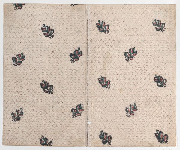 This sheet with a dot grid pattern and bouquets was made anonymously with ink and watercolor. The pattern suggests that the sheet was designed for mass production, perhaps as wallpaper or fabric. It is a reminder of the social and economic structures of its time, referencing both consumerism and the labor involved in producing decorative items. The dot grid hints at industrialization and standardized design, while the floral bouquets add a touch of traditional artistry. To truly understand this piece, we might research the history of wallpaper and textile production, the social status of the anonymous artisan, and the cultural meanings of floral patterns. By studying the material culture and economic history of the time, we can gain insight into the meaning and significance of this seemingly simple artwork.