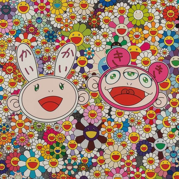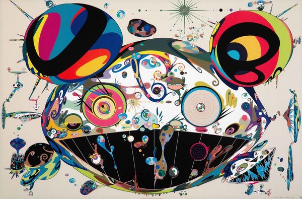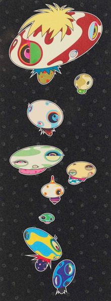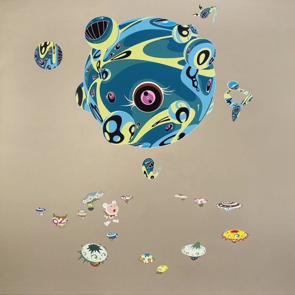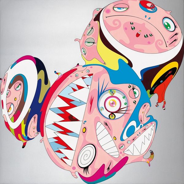 Curator: My first thought is... candy! The forms and colors give it this playful, almost saccharine quality. Editor: Indeed! Today we are observing "!N-Cha!," a work executed in acrylic paint by Takashi Murakami in 1999. His blend of pop art and digital techniques certainly produces a singular effect. I’m wondering what you make of these cartoon-like forms that seem to drift across a bright white expanse. Curator: I'm interested in the manufacturing process and the artist's studio setup. Murakami's employment of assistants is quite common now, yet the conversation around mass production and the aura of uniqueness in art is still something we’re untangling, wouldn't you agree? Editor: Certainly. But within this work I find compelling harmonies. See how Murakami manipulates gradients and contours to simulate depth, or how those bulbous fungal forms repeat. There’s something both soothing and unsettling in those vast, pupil-filled expanses. They almost seem to watch the viewer. Curator: Those repetitive motifs are signature Murakami. The "superflat" aesthetic as he terms it is his commentary on flattening cultural hierarchies post WWII and consumer culture in Japan. This has led to massive commercial successes; collaborations with Louis Vuitton and Kanye West. What do you see here with the use of that style? Editor: By minimizing depth and flattening planes, Murakami cleverly evokes the feel of commercial art, yet he also flirts with themes in traditional Japanese art that utilize similar conventions. And he achieves an intriguing tension. How do you weigh those collaborations against his artistic intent? Curator: In terms of accessibility and democratizing art I think there's something interesting there, but ultimately how the final pieces enter into a system of late-stage capitalism creates problems within that, despite good intentions. His works become part of luxury brands. The work almost functions as branding itself, does it not? Editor: It is certainly an interesting juxtaposition! One could spend quite a long time analyzing this canvas. For me it raises important points about the tension between popular culture and visual structure. Curator: For me, seeing how labor, materials, and consumerism converge makes you think. I come away pondering the socioeconomic web in which a work like this exists.