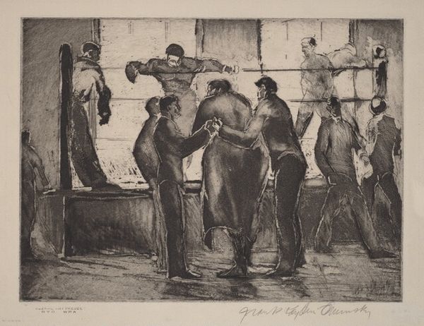 Minna Citron created this lithograph print, Laying the Bets. Citron's social realism emerged during the interwar period, a time of economic hardship and shifting social values. Note how the working-class men huddle around a roulette-style wheel as if for warmth and comfort. The men appear as a collective, their identities submerged into one another. The figure operating the game stands apart. The print invites us to think about the role of chance and desperation in the lives of working-class men during the early to mid 20th century. Citron’s focus on class and labor, especially within the context of the Great Depression, offers a compelling commentary on the economic anxieties of the time. Here, Citron creates a narrative that exposes the vulnerability of working-class men, highlighting the emotional toll of economic instability.
