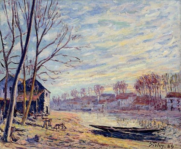 Editor: We’re looking at Alfred Sisley's “The Seine near Saint Cloud, High Water,” painted in 1879 using oil paint. There's such a subdued atmosphere about it – almost melancholy, despite the subtle impressionistic brushstrokes that try to convey life and movement. What grabs you about this piece? Curator: Well, isn't it interesting how a flood can both devastate and inspire? Sisley captures the stillness after the deluge, that quiet, contemplative moment when the water has risen and everything holds its breath. I see a reflection on impermanence, a whisper of the unstoppable power of nature, couched in these beautiful, soft colors. It is melancholic but not hopeless; the light insists on peeking through the clouds, doesn’t it? Does the composition make you feel something particular? Editor: It's interesting you mention light, because the reflections in the water are pulling my eye. It gives a sense of depth, but also makes the scene feel hazy, almost dreamlike. Curator: Precisely! Sisley’s genius, in my view, lies in transforming the mundane into the magical, a common theme for many Impressionists. What do you make of the two figures standing by the water’s edge? What are they doing, reflecting? Editor: Perhaps they’re contemplating the flood's impact or just enjoying the serenity of the moment – a quiet pause in a busy life. It makes me wonder if they're even aware of us, the viewers. Curator: And isn’t that a profound observation? Maybe we are all reflected, or can become reflective if we give nature the time and attention, but are rarely aware when this transition happens. Sisley nudges us towards these introspective moments. So what do you feel now, Editor, with your new awareness of a dialogue about our perception? Editor: It gives me a lot to reflect upon. The beauty of Impressionism is that the paintings never shout answers. There is so much space for a dialogue about what it makes you feel!