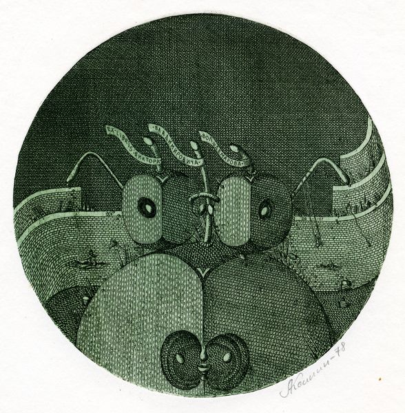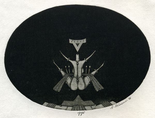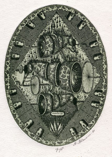 Oleksandr Aksinin created this bookplate for Volodya Polishuk in 1982 using etching. At first glance, the monochromatic palette and dense composition of intricate details in an oval format might evoke a dreamlike atmosphere. Looking closer, the structural arrangement of the bookplate reveals a symbolic language. A whimsical chariot, pulled by two horses in opposing directions, becomes a stage for a figure with an elongated hat, flanked by objects resembling light bulbs, arrows and other figures. The chariot's wheel, adorned with complex patterns, grounds the fantastical scene. This composition prompts us to consider the underlying codes at play. The opposing directions of the horses may represent internal conflicts, while the figure and objects could symbolize knowledge and creativity. This bookplate transcends its functional purpose, inviting viewers to decode its visual metaphors and contemplate the relationship between image and meaning, author and reader, and art and interpretation.