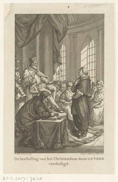 Editor: We're looking at "Zitting van de Spaanse Bloedraad," or "Meeting of the Spanish Council of Blood," a 1735 engraving by Jan Caspar Philips. The density of the lines and the stark contrast give it an almost unsettling feel, even though it depicts a formal gathering. How would you interpret its composition? Curator: From a formalist perspective, observe how the artist organizes space through the strategic deployment of light and shadow. The composition is acutely pyramidal, anchored by the central figure enthroned under the canopy. Note also how the linearity of the engraving technique emphasizes the angularity of the architecture and the figures' poses, creating a sense of rigid formality. This controlled use of line and form communicates a deliberate austerity. What effect do you think this structured formality achieves? Editor: It seems to amplify the sense of power and control. The clean lines and hierarchical arrangement reinforce the authority of the figures depicted, and also make a stark, declarative impression on the viewer. Is that a fair assessment? Curator: Precisely. And consider the negative space—or rather, the almost deliberate lack thereof. The scene is crowded, packed with details, intensifying the visual weight and psychological impact of the event portrayed. How might that density contribute to the viewer’s experience? Editor: The density and detail make me feel a bit claustrophobic. It amplifies the feeling of tension, the heavy atmosphere. It makes me really appreciate the artistic control shown in the work. Curator: An excellent point. The starkness and precision highlight not only the depicted event but also the engraver's skill. This controlled and meticulous execution underscores the power inherent in representation itself. Editor: I see what you mean. Looking closely at its structure has certainly provided a new depth of understanding to this baroque print!