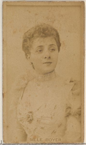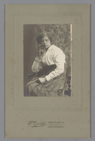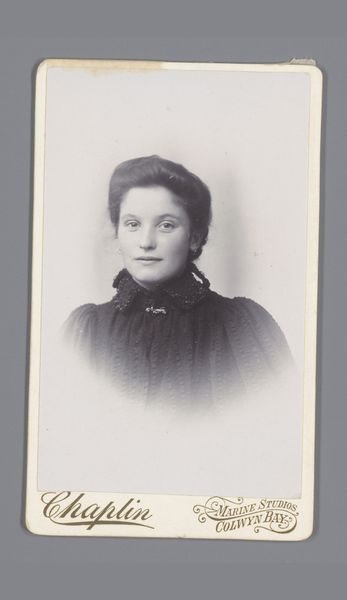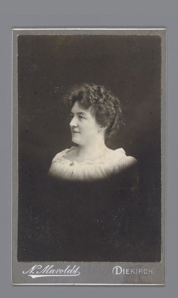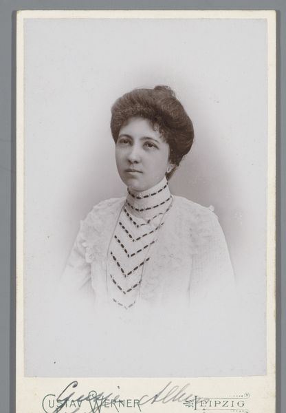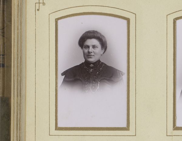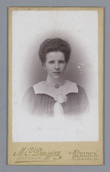 Editor: So, this albumen print portrait, titled "Portret van een onbekende jonge vrouw", dates to between 1900 and 1914. I’m struck by its formality, yet also the slight blurring, hinting at movement and disrupting that strict pose. What do you see in it? Curator: I am drawn to consider the labour embedded within this object. The albumen print, a popular photographic process during this era, reveals so much. Think about the process of making this object. From preparing the glass plate negatives, mixing and coating them with albumen—derived from egg whites—then exposing and developing each print. It was intensive labour. Editor: Egg whites, really? That is fascinating, I did not know that. How would you then relate such means of production to consumption at that time? Curator: Well, portrait studios like veuve Soyer democratized image production. The rise of the middle class created a demand for affordable portraiture, impacting the labour of photography. Albumen prints were mass-produced to feed into that consumerism. Note that the backdrop appears to be dark. I am curious about the staging and props used to construct this idealized vision of young womanhood, particularly how she is adorned and costumed. Can we understand these decisions about attire within its consumerist drive? Editor: Interesting point about consumption and image making, especially how studio portraits can tell us about societal aspirations. This print certainly expands what it means to see an ‘image’. Curator: Indeed. By examining the materials and mode of its production we better appreciate its impact and purpose in this moment of consumerism.