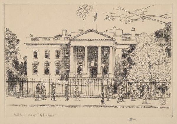 Curator: Childe Hassam’s etching, "The White House," presents a fascinating depiction of American political power. Editor: It’s striking how immediate it feels. The sketched lines give it an ephemeral, almost vulnerable quality, despite the gravitas of the subject. Curator: Hassam, known for his Impressionistic style, often imbued his cityscapes with subtle symbolism; here, the White House is framed by foliage, perhaps suggesting the relationship between governance and the land. Editor: And etched lines, you know, they’re so economical, direct. It really underscores the human hand in representing, even constructing, this national icon. The labor is right there. Curator: Absolutely. Consider also the emotional weight carried by this building; it represents both stability and the potential for change. Editor: Yes, it's interesting to think about how the choice of etching elevates a quotidian political setting into something quite profound. Curator: Indeed, it's a potent reminder of the complex layers embedded within seemingly simple representations. Editor: Agreed, Hassam prompts us to consider the material process and symbolism in shaping our perceptions of power.