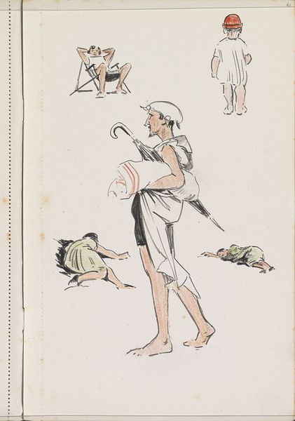Curator: “Spelende kinderen op het strand,” or “Children Playing on the Beach,” by Otto Verhagen, executed around 1930, employs watercolor and drawing techniques. It’s a rather charming snapshot, capturing children at leisure. What are your initial thoughts on its construction? Editor: It feels very informal, like a page from a sketchbook. The composition is almost scattered, with these little vignettes of children arranged across the page. How do you interpret this work, focusing on the artistic choices rather than just the subject matter? Curator: Precisely. The application of watercolor appears swift, almost impressionistic, wouldn't you agree? The artist isn't striving for photorealism, but rather capturing a fleeting moment, the essence of childhood activity. Note how the figures are delineated with quick, confident strokes of ink. This gives them definition against the pale wash of the background, emphasizing their forms through contrast. Do you perceive a hierarchy in the arrangement? Does any one figure demand your attention more than others? Editor: Not particularly, although the child in green seems slightly more detailed, more fleshed out than the rest. What would you say the formal elements tell us about Verhagen's artistic intentions here? Curator: The artist seems primarily interested in conveying movement and capturing the spontaneous energy of the scene, foregoing the constraints of academic painting. The flatness of the picture plane is maintained by the lack of depth or atmospheric perspective; and through the varied mark-making the viewer sees the image's physical construction. Do you find that this approach enhances the overall sense of immediacy? Editor: It certainly does. It feels less like a composed painting and more like a direct observation. I now recognize the artistic intention behind the “scattered” composition – it emphasizes the fleeting, unscripted nature of children’s play. Curator: Indeed. By analyzing its formal elements, we can begin to decode Verhagen’s artistic vision and intentions in this unassuming beach scene. Editor: It's fascinating how focusing on technique and composition can completely shift your understanding of a seemingly simple piece.