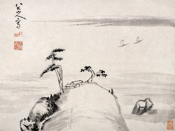 Editor: This is "Noh Play Hachinoki," a watercolor and ink hanging scroll by Shibata Zeshin, created around the 19th century. It's a striking image because of the vast negative space and the delicate depiction of the birds. What narratives do you see embedded within this piece? Curator: I see a compelling commentary on social mobility and the perception of worth in 19th century Japan. The Hachinoki story itself, a tale of a impoverished samurai’s unexpected reward for offering hospitality, speaks volumes. What does it mean to display humility versus ambition in a rigid class structure? Consider how Zeshin uses negative space to evoke a sense of emptiness or potential – whose potential are we really considering? Editor: That's a really interesting point. I hadn’t thought about the empty space representing unrealized potential or the constraints of social class. The three birds, then, become almost symbolic of the protagonist's journey, maybe their flight representing his aspiration. Curator: Exactly. Now consider the ukiyo-e tradition Zeshin is working within. While often associated with entertainment districts and depictions of courtesans, it could also be used to subtly critique societal norms. How can we read this seemingly simple landscape as a quiet protest against inequity? What’s missing from the picture, and why does that absence feel so significant? Editor: So, beyond just a pretty landscape, we’re looking at a potential statement on social justice through artistic symbolism? I initially saw only beauty, but now recognize layers of meaning rooted in history. Curator: Precisely! Art often provides a safe space to address difficult conversations, like questioning assumptions around value and worth. Always ask yourself: who is privileged and who is not represented? Editor: I learned a lot about looking at art through a sociological lens. This really expanded my understanding beyond just aesthetics. Curator: And for me, your perspective reinforced the importance of initial reactions to guide deeper investigation. Thank you!