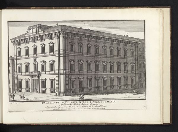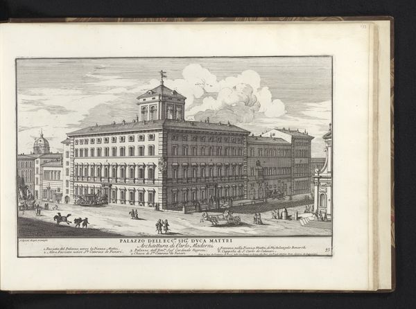Editor: This is Alessandro Specchi's 1699 print, "Palazzo Nuñez-Torlonia in Rome." The meticulous lines capture the grand facade of the palazzo, but it feels almost...clinical, removed from the life of the city despite the tiny figures in the foreground. What story does this cityscape tell, beyond architectural representation? Curator: It tells a story of power, Editor. Think about the role of prints like this in the 17th and 18th centuries. They weren't just documentation; they were a form of architectural propaganda. The Palazzo Nuñez-Torlonia, newly built, wanted to project an image. What better way than a widely circulated print, showcasing their wealth and refined taste? Notice the careful detailing, the emphasis on symmetry and classical elements. Editor: So, it's less about the reality of the building and more about the ideal it represents? How would the average Roman citizen have viewed a print like this? Curator: Exactly. It's carefully staged. While portraying an aspect of Realism, its message transcends pure replication. For the average citizen, this image could evoke feelings ranging from admiration to envy, or even resentment. It depends on their relationship to the Nuñez-Torlonia family and the socio-political climate. Who has access and control in this era? Whose stories are prioritized over others? Editor: I see, it’s more than just a building; it's a statement about social hierarchies and the power of the elite within the cityscape. The print itself is an instrument in shaping public perception. Curator: Precisely. Consider who commissioned and distributed these prints. Who benefitted from their circulation? By framing the building in this way, the print reinforces existing power dynamics. It wasn't merely capturing a likeness; it was constructing a narrative. Editor: It's fascinating to realize how much this single image, seemingly objective, is actually embedded in the politics of its time. I initially saw it as a straightforward depiction, but it's clearly so much more. Curator: And that, Editor, is why studying art through its historical context is so important. The art reveals social contexts, when interrogated.