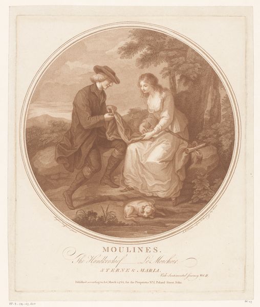 Editor: Here we have "Insane Mary," an oil painting by Angelica Kauffmann. The Hermitage Museum houses this piece. At first glance, I’m struck by the almost theatrical, staged quality of the scene. What layers do you see beneath the surface of this work? Curator: Kauffmann, even when depicting what we would now consider medical conditions, layers the work with potent symbolism. Mary’s loose hair, indicative of a loss of control or reason, contrasts with the gentleman's structured attire and composure. He holds out what looks like fine fabric—an offering perhaps? What do you suppose it symbolizes? Editor: A gift, or perhaps a bribe? I notice the little dog at Mary’s feet. Its leash is broken. Does that imply the breaking of bonds, of restraints? Curator: Precisely! Consider the rose she holds: beautiful, but its thorns signify pain and perhaps lost love. Remember Ophelia from *Hamlet* and how artists depict her? Editor: There's a thread! A thin, frayed thread trailing from Mary’s hand to the dog. It almost looks like she's about to unravel, like the thread represents the tenuous hold she has on reality. Curator: You are spot-on. The landscape mirrors her inner state, blending beauty and wildness. It is contained by this oval framing, but it pushes out against the boundary. That tension reinforces the complexity of "Insane Mary." Kauffmann acknowledges vulnerability and madness while retaining the subject’s humanity, creating both empathy and understanding. What will you remember the most about it? Editor: It is a reminder to consider the psychological and social context when looking at this portrait – insanity had potent symbolism in 18th-century Europe. I'll definitely be revisiting this with new eyes! Curator: A painting like this reminds us that art offers a window into our shared humanity and our ongoing effort to understand each other's hearts and minds.