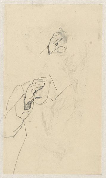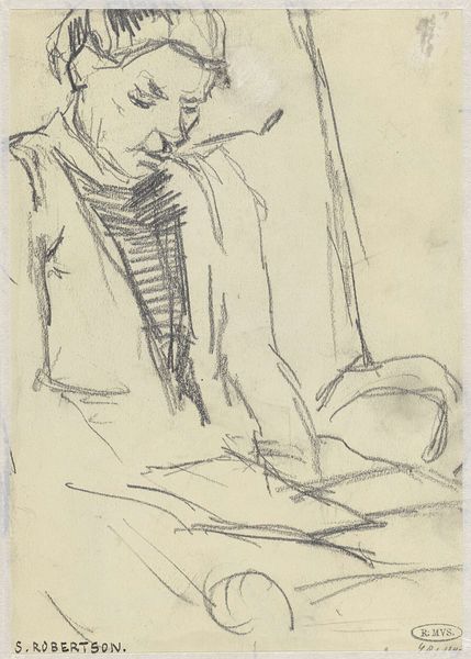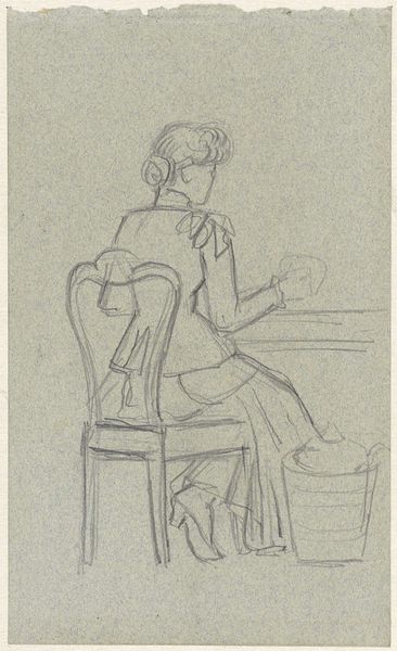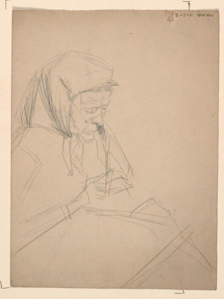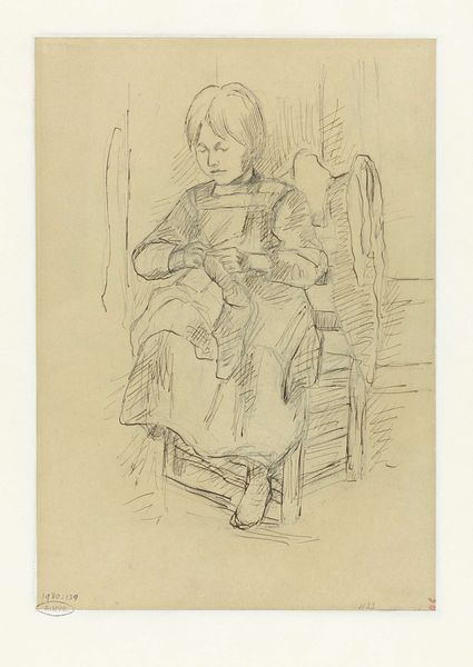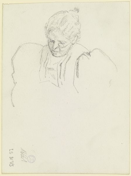 Curator: Looking at this drawing, "Handwerkende Vrouw" by Jozef Israëls, I see something intensely private, almost voyeuristic, don’t you think? It’s just pencil on paper, and the date’s somewhere between 1834 and 1911, so it's got a bit of history imbued in it. Editor: Yes, the term ‘voyeuristic’ jumps out, absolutely. It feels… fragile. The pencil lines are so tentative, barely there in places. But I immediately register that stooped posture as universally maternal, you know? All the attention and focus directed downward. Curator: Maternal for sure, but to what end? What story is the woman making? See those swirls, are those ears, of hair piled atop her head? Reminds me of when I am wrestling with a problem; knotting string to string of loose associations trying to conjure new meanings, stitch some greater answer. Editor: Indeed! The gesture of handwork – the sewing, the mending, the careful joining of separate pieces – that's powerful! I perceive an old symbol that unites all. The Fates spinning and measuring the thread of life, Penelope weaving her web… Work provides life! And a link to what came before. Curator: A lovely connection, the mythological element that makes this everyday sketch so evocative. I can't help but project that this woman could just be sat anywhere stitching; maybe it doesn't need to say everything about being maternal. The drawing style lets her spirit inhabit a blank canvas which she must then herself bring life too by filling that blankness with the fabric that provides or is broken by its need to exist through labor. Editor: But it also touches upon a particular societal… perhaps ‘burden’ is too strong a word, of course. I keep picturing all of those female figures from folklore and literature, trapped in domestic cycles, yet transforming those limits into something meaningful, something beautiful, perhaps in secret rebellion or through just an act of grace. Curator: It could go in any number of directions! And to its creator Israels' credit; the artist allowed the woman who is sewing freedom by never tying her down. He captures her quiet labor and lets others put upon herself whatever constraints exist for others while giving all possible credit to its significance at different times. Editor: What a marvelous dance of revelation and reservation this drawing creates; between seeing both woman at play but seeing her not as much. Now that’s art to make one consider and contemplate on all planes.