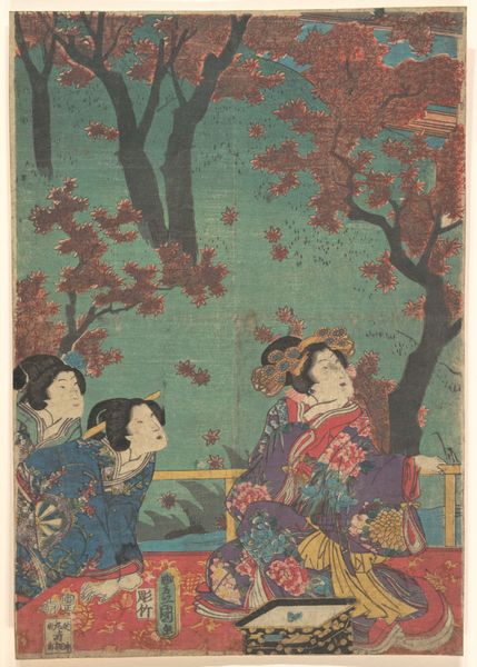 Editor: Here we have Utagawa Kunisada's "A Spring Banquet for the Eastern Genji" from 1856, a woodblock print that presents a scene of women in a garden setting. There is something about this piece that feels timeless. What symbolic elements stand out to you? Curator: I’m immediately drawn to the cherry blossoms. Think about it: in Japanese culture, they're deeply tied to the ephemeral nature of life, a constant reminder of beauty's fleeting presence, urging one to seize and celebrate the present. Also, notice the presence of musical instruments? Editor: Yes, there's a shamisen! So how might the combination of these motifs inform our understanding? Curator: It suggests the ritual of music and beauty are consciously staged. It tells us about an intention to imbue every action with purpose. It is as if they are aware of their performance. Do you also feel a distinct stillness amidst what is presumably supposed to be a "lively" banquet? Editor: I do; the scene feels staged. Almost as though the figures are arranged purposefully for a photograph. Curator: Exactly. And doesn't that itself prompt consideration on how identity can sometimes feel performative, requiring certain stage settings or cultural references? Editor: I had not thought of it that way. It really invites us to look closer. I am seeing many of these elements in a new way now. Thank you. Curator: My pleasure. Art always reflects the observer in profound ways; this piece especially feels relevant to understanding symbolic traditions.