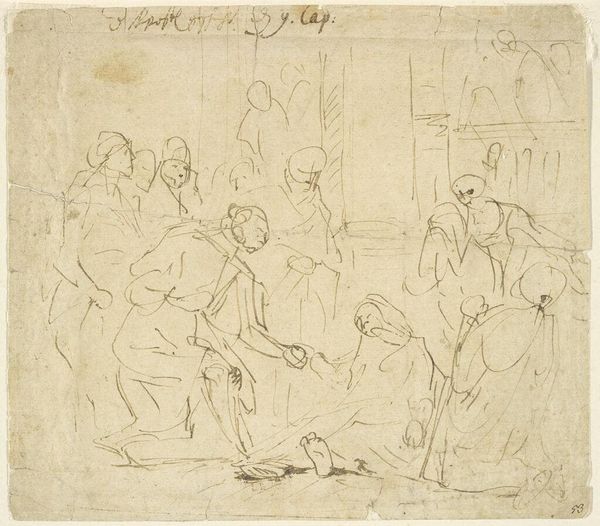 Editor: Here we have Giovanni Battista Tiepolo's "The Sacrifice of Iphigenia," a pen and wash drawing from around 1726. There's a real rawness to the composition that I find intriguing, particularly in the energy created by the open linework and wash. What stands out to you as you look at the image? Curator: Indeed, the dynamic composition commands immediate attention. The use of line is particularly striking; consider the function of hatching to create shading and model form with these minimal resources. This is critical in the language of baroque art. Notice the central figure; how do the artist's decisions emphasize their emotional and narrative weight through line and spatial composition? Editor: So you're focusing on how Tiepolo has used his technique to build both emotion and storytelling through a complex compositional structure? Curator: Precisely. By engaging the internal structure we discover its expression. Take note of the open space behind the High Priest; observe how it isolates the gesture toward the sacrifice as being separate from those observing from behind. What do you note when you focus on this specific portion? Editor: It feels like it both amplifies the High Priest and yet somehow seems to soften or dilute his decision because we have an escape available. Thanks, that’s given me a lot to think about from a completely new angle. Curator: The formal elements reveal both a rich narrative potential, but the formal execution helps illuminate the cultural narrative represented here in its formal elements. I hope you found this insight insightful as well.