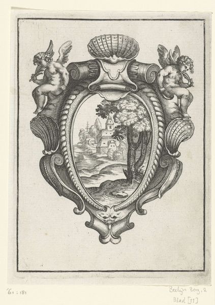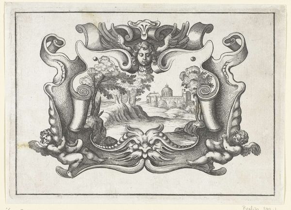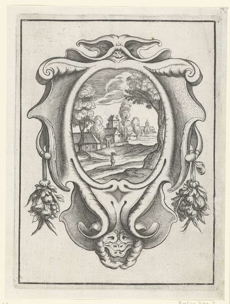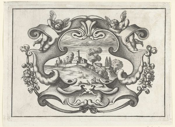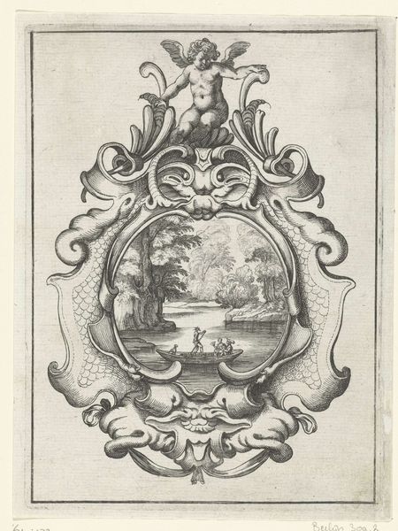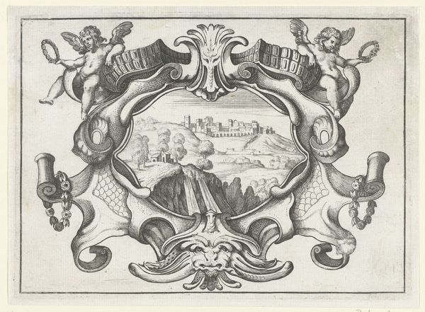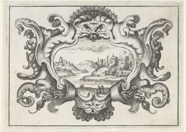 Editor: So this etching, "Cartouche met nautische attributen" from 1632 by Daniel Rabel, frames a coastal scene within this elaborate ornamental border, full of marine imagery. It feels very... contained, yet also evokes a sense of exploration. What strikes you when you look at this piece? Curator: The cartouche itself speaks volumes about the era's complex relationship with maritime power. We see classical symbols – dolphins, seashells – intertwined with tools of navigation, like the compass, framing the landscape of a harbor. It's essentially packaging the sea as a commodity, controlled and understood by those with the right instruments and knowledge. Editor: I see what you mean. Like, it’s not just celebrating the sea, but claiming dominion over it? Curator: Precisely. Consider who would commission such a work. This isn’t just decorative; it’s a statement about power, trade, and perhaps even colonial ambition. Who gets to map the world? Who benefits from maritime trade? It prompts questions about the human cost often erased from such seemingly celebratory imagery. How does seeing it that way shift your initial impression? Editor: It definitely makes it feel less romantic and more...political, maybe? The containment you mentioned becomes less about decoration and more about control, both artistically and politically. Curator: Exactly. The beauty serves to naturalize this claim of dominance. By understanding this context, we move beyond simply appreciating the artistic skill and engage with the ideologies it promotes. Editor: This really opened my eyes. I had never thought that something seemingly innocent could harbor complex political implications. Curator: Art is never neutral. It always reflects and shapes our understanding of the world, and power. Learning to see these nuances is crucial.