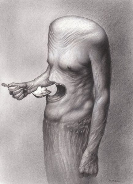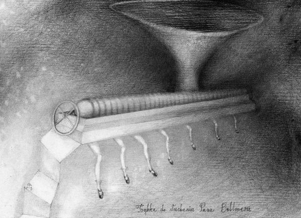 Lech Jankowski made this drawing, titled "Trąbka do słuchania krzesła Pana Kantora", with graphite, and it feels like a quiet proposition about how we can look at things. The artist has coaxed so much out of pencil here, it's really something. There's this strange, diffused light, almost like a dream. Look at the soft rendering of the bulbous forms, they give the image a really ambiguous feeling. The textures are incredible too. See how the chair is more clearly defined, and the parallel lines at the top contrast with the fuzzy ground? Even though the tonal range is narrow, the mark making shifts your attention around. The drawing has this push-pull effect, between the clear, descriptive lines of the chair and the more ambiguous space around it. Jankowski's image reminds me a bit of Giorgio Morandi's still life paintings, where simple objects become stand-ins for complex ideas. It feels like Jankowski is asking us to reconsider the relationship between seeing and understanding, or maybe even hearing! What do you think?