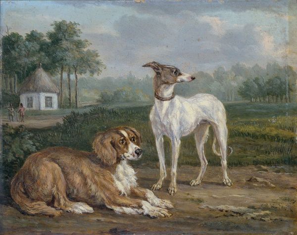 George Morland’s painting, Setters, offers a tranquil scene executed with soft, blended brushwork that emphasizes form and texture. The foreground is anchored by the ochre and white dog, its horizontal pose creating a sense of groundedness. Behind, the monochromatic dog provides a vertical contrast, suggesting a watchful alertness. Consider the composition: Morland employs a classical structure, arranging the dogs to create a balanced, yet dynamic interplay. The subdued palette reinforces a mood of quiet observation, inviting us to reflect on the relationship between humans, animals, and the natural world. Morland challenges the traditional hierarchy within genre painting by focusing on the inherent dignity of the animals. Ultimately, Setters prompts us to reconsider our assumptions about art's subjects. By presenting these dogs with such quiet dignity, Morland elevates the mundane, inviting us to find beauty and meaning in the everyday.