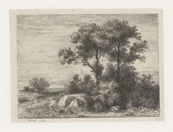 Jean Alexis Achard created this small etching, titled 'Trees and Shrubs on a Hill', using ink on paper. It’s a scene that looks quite ordinary: trees and shrubs clustered on a small rise. But it’s precisely this sense of the everyday that gives it cultural resonance. Made in 19th-century France, it reflects a broader artistic movement away from the grand historical and mythological subjects that had dominated earlier art academies. Instead, artists like Achard turned their attention to the local and the familiar. This shift mirrors a changing social landscape, where the rise of the middle class and the growth of cities created new audiences with different tastes and values. These viewers weren't necessarily interested in the stories of kings and gods, but rather in reflections of their own lives and experiences. To understand the art of this period, we need to look beyond the canvas. By exploring social histories and institutional shifts, we can begin to appreciate the complex ways in which art reflects and shapes the world around us.