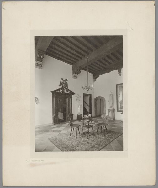 This photograph titled 'Vierschaar met de Rechtvaardigheid in het stadhuis van Nijmegen' was taken by Johannes Gerardus Kramer sometime between 1845 and 1903. It captures the ambiance of a courtroom or council chamber, a space laden with the weight of decisions, justice, and the silent stories of those who stood before it. The image presents a scene steeped in the historical and social frameworks of governance. The high-backed wooden chairs and the statue of Justitia towering above, embody the solemnity and power associated with legal proceedings. The photograph doesn't just show a room; it evokes the experience of being judged, of being part of a community governed by laws, and of the complex interplay between justice and power. During Kramer’s time, photography served not only as documentation but also as a reflection of societal values and ideals. What kind of justice was being served in this chamber? Who had access to it and who was excluded? This image invites us to reflect on the evolving notions of justice and the spaces in which they are enacted.