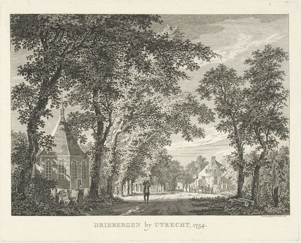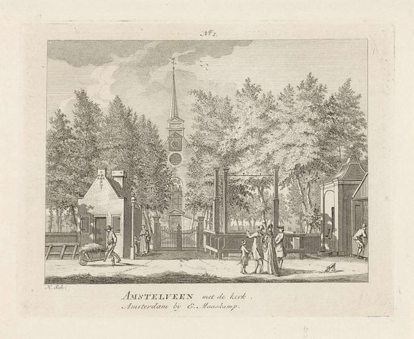 Editor: So, this is “Gezicht op Kortenhoef,” or "View of Kortenhoef," a print made by Hendrik Spilman sometime between 1742 and 1784. It looks like an engraving. What I find interesting is how everyday it feels, just a scene of people in a village. What strikes you about this print? Curator: This work offers an intriguing perspective on the material conditions of 18th-century Dutch society. The engraving technique itself, involving the labor-intensive carving of lines into a metal plate, speaks to a specific mode of production. Consider how this differs from painting – an act often seen as more individualistic and "high art." How does the print medium change how you perceive this work? Editor: Well, knowing it's a print, and presumably reproducible, makes it feel more like a document or a piece of social commentary rather than a singular artistic statement. Curator: Exactly! The image depicts a village scene, yes, but the presence of the church, the bridge suggesting commerce, and the figures themselves give insight into the daily life and social structure. How might this image have been circulated and consumed? Who had access to these prints, and what needs might they have satisfied? It's not about individual genius, but about wider cultural production and consumption of images. Editor: So it's less about what Spilman intended, and more about the material realities that enabled this image to exist and circulate? Curator: Precisely. This print offers us a window into the world of 18th-century Kortenhoef – not through grand narratives, but through the mundane details of its material existence and its subsequent impact on viewers across space and time. It encourages us to consider who controlled the means of producing and distributing these images, and to whom they were accessible, raising important questions of economics and accessibility. Editor: That really shifts how I see it. I was initially drawn to the peaceful scene, but thinking about it as a product of labor and social forces gives it a whole new level of depth. Curator: Indeed, by interrogating the means of its production and consumption, we've unearthed new pathways to contextualizing and comprehending this artwork.