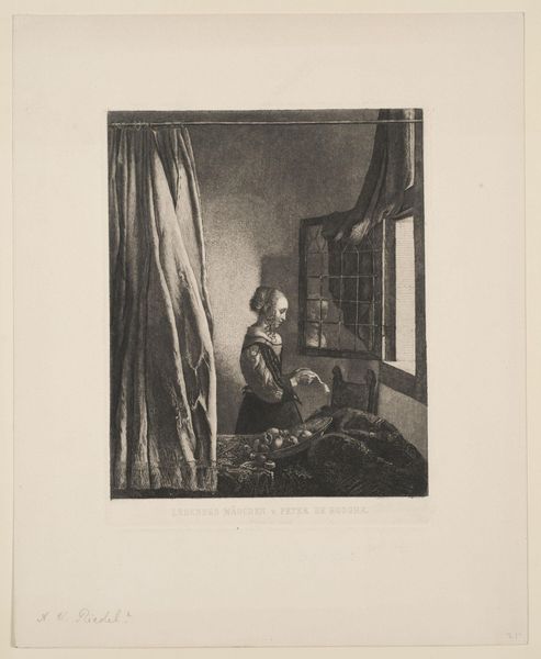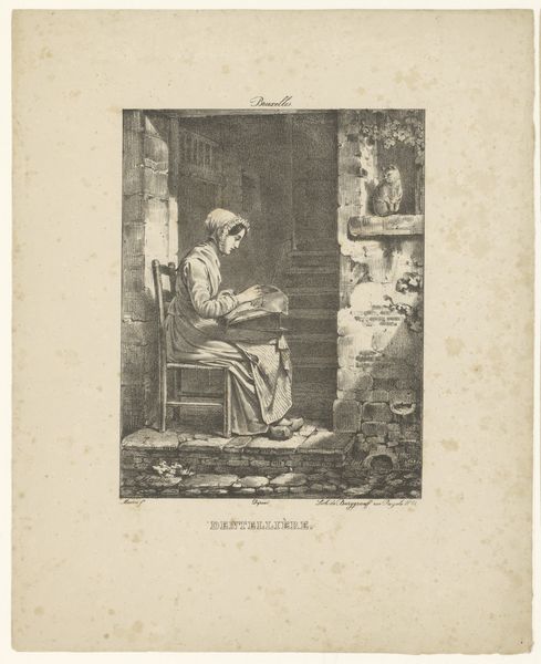 Curator: Let's consider this 1822 engraving by Antoine Béranger, entitled "Lezende vrouw met kind in de deuropening van een huis" or "Woman Reading with Child in the Doorway of a House." It exemplifies early 19th-century genre scenes. Editor: It evokes a strong sense of tranquility. The monochromatic tones and the composition's focus on the woman create a quiet domestic narrative. Curator: Béranger's piece taps into the romantic interest in portraying the everyday lives of ordinary people. Prints like this gained immense popularity as affordable ways to disseminate images and values. Editor: Indeed. The positioning of the woman—almost centered within the doorway that is the frame—suggests the liminal space occupied by women. Home as their prescribed space, but connected to the larger world. What is she reading, and what are the effects of this narrative on the child looking on? Curator: The choice of engraving as a medium is also crucial to understanding its impact. Prints allowed for the mass distribution of imagery, democratizing access to art and information, which was particularly powerful in a society undergoing significant social changes after the Revolution. It also has links with print media used in radical pamphlets and the like. Editor: Yes, I also think about how the print participates in ideas around knowledge and education. The image shows a kind of self-possession via reading. The woman isn’t simply a passive figure in her domestic space but is actively engaged with the text in front of her. What is that knowledge *doing* for her, and how does that image operate as a kind of proto-feminist representation? Curator: And how the window creates a mise-en-abyme effect. We see an image within the image; just as books transport, this architectural window serves a similar purpose by acting as a pictorial portal to the outside landscape. Editor: I agree; the doorway suggests an aperture—an opportunity. This simple image opens so many important dialogues about access to information and representation within gendered contexts. Curator: Béranger successfully uses art to show us the socio-political status and environment, encapsulating the quiet strength and influence that resides within domestic life. Editor: It resonates, still. Art from any period provides a view to its own time, but also helps us clarify our present.