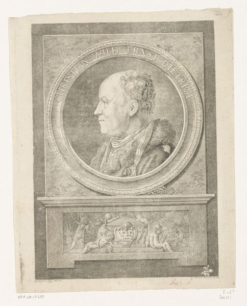 Christoph Daniel Arzberger made this self-portrait etching sometime before his death in 1793. It raises questions about social identity and representation in the late 18th century. The image presents Arzberger in profile, framed by an oval border set within a stone-like rectangle, complete with symbolic vegetation. Born in Nuremberg, Germany, Arzberger would have been part of a society undergoing significant social and intellectual change, shaped by Enlightenment ideals and emerging middle-class values. This portrait reflects the period's interest in individual identity and self-representation. The choice of a profile view, the framing elements, and the inclusion of his name all contribute to constructing a specific public image. Further research into Arzberger’s life and the artistic conventions of 18th-century Germany would enrich our understanding of this portrait. Careful examination of the printmaking techniques used and study of the institutional context of artistic production in Nuremberg would provide deeper insight into its meaning and cultural significance.