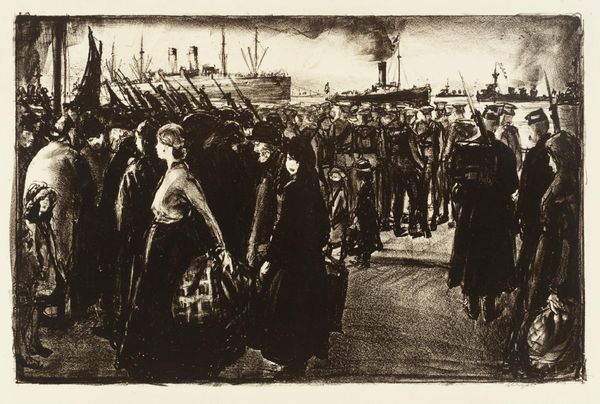 Boris Kustodiev captures a May Day demonstration in Putilov with striking visual dynamics. The painting is dominated by the bold red of the flags, which contrasts against the muted palette of the industrial backdrop and the sombre crowd, evoking a sense of fervent energy amidst a bleak reality. Kustodiev uses colour not just to depict but to signify, turning the red flags into powerful symbols. The composition, with its dense gathering of figures and looming factory chimneys, suggests a society on the brink of transformation. The artist's use of line and texture further enhances the painting's emotional depth; the rough, almost sketch-like quality of the figures and landscape creates a sense of immediacy. The flags disrupt the uniformity of the crowd below and challenge the established industrial order, becoming an active agent within the pictorial space. This is not just a representation of a historical event, but an articulation of revolutionary desire through the language of colour and form. Meaning isn’t fixed but emerges from the ongoing tension between visual elements and cultural interpretation.