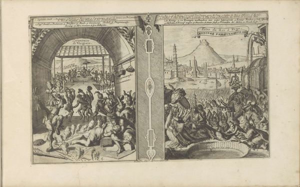 Editor: At first glance, the print evokes a sense of dense, almost overwhelming activity. What's the narrative thread binding these bustling scenes together? Curator: This engraving by Romeyn de Hooghe, dating between 1682 and 1733, bears the title "Doopceremonies; Berg van Abessinië," now held in the Rijksmuseum. It presents two distinct, yet related, tableaus depicting, ostensibly, baptismal ceremonies in the Kingdom of Abyssinia or Ethiopia. Editor: The linear quality of the engraved lines—they really guide the eye. And the contrast between light and shadow emphasizes certain actions. I wonder what kind of ink the artist used to render this tonal range? Curator: Notice how de Hooghe uses a fine line to construct intricate compositions. The linear networks and their intersections produce light and shadow effects and an almost baroque-style dramatic effect. Each mark results from deliberate manual work – a point that invites us to consider the means and relations of production inherent to printmaking during this historical period. Editor: I see a very intricate scene on the left with what appears to be a Christian baptism occurring indoors, contrasting with a very regimented, outdoor scene on the right. Is it a depiction of royal or noble baptisms? Curator: Indeed. Structurally, the print functions on several visual registers simultaneously, from a landscape view to the interior spaces which suggest an architecture to an overarching historical theme. Semiotics helps us identify these signifiers. One could spend a long time just mapping the distribution of meaning on the print's surface alone. Editor: These scenes almost seem to represent the conversion of an entire community or an entire empire and therefore suggests a certain exercise of control. How interesting it is to imagine the labor involved in producing numerous copies of these scenes. Curator: Ultimately, the artist masterfully uses a limited set of materials, namely, the plate, the ink, the engraving tools, to create a work brimming with texture and symbolism, both aesthetically refined and historically suggestive. Editor: This exploration underscores the inherent labor in early printmaking and reveals the layers of representation. Thank you for helping me observe the art so diligently and mindfully.