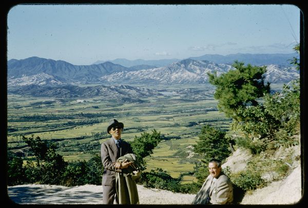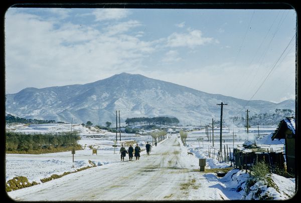 Editor: Here we have David Ketel's photograph, "Winter near Busan, Christmas Day 1952," possibly taken during his time serving in the Korean War. It’s currently held at the Rijksmuseum. What strikes me is the sharp contrast – a tranquil, almost picturesque foreground of snowy hills, and in the distance a flat expanse, seemingly barren. How do you interpret this contrast? Curator: Well, let's think about what winter, as an image, typically evokes. The bare trees, the snow, they often symbolize dormancy, a time of reflection or even mourning in the cyclical understanding of nature. The fact it's Christmas Day infuses it with themes of hope, but tempered by this barren vista in the distance. How does this setting of a snowy foreground and barren landscape connect with the viewer’s understanding of renewal? Editor: So, you’re suggesting that this idyllic foreground clashes directly with the context of war, that barren landscape potentially hinting at the destruction of conflict? Curator: Exactly! Notice how the lines of the landscape lead our eye toward that horizon, potentially a zone of conflict or uncertainty. There's an ambivalence here. The enduring symbols of winter – snow, pines – meet a landscape marked, perhaps, by impermanence or trauma. Considering Ketel was a military photographer during a war, does the photograph’s seeming “tranquility” feel forced? Is that perhaps part of the power of the image? Editor: It certainly reframes my perspective. What initially seemed serene now feels deliberately juxtaposed with an underlying tension. Curator: Indeed. It encourages us to think about how familiar symbols can hold multiple layers of meaning, particularly when viewed through the lens of specific cultural and historical contexts. This image is not simply "winter;" it is winter observed amidst conflict. What will viewers today feel, knowing what was taking place nearby in 1952? Editor: It’s powerful how seemingly disparate elements converge, offering a richer, much more poignant narrative. Curator: Precisely, David Ketel makes you question what the symbols of nature truly mean.