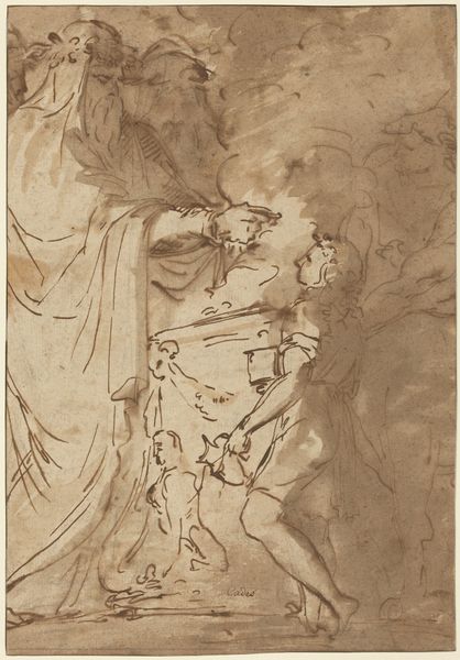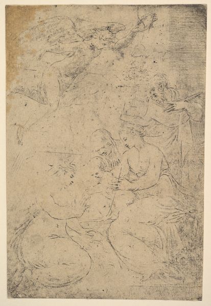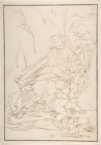 Editor: This drawing, "Die Heilige Familie mit dem Johannesknaben" by Luca Cambiaso, seems to depict the Holy Family with Saint John the Baptist. It’s created with pen and ink, and I'm struck by the sketch-like quality, almost like a study. What do you see when you look at this piece? Curator: As a materialist, my attention is drawn to Cambiaso’s *process*. The loose ink lines, the visible labor... it speaks to the rapid method he employed. The sheer *quantity* of drawings Cambiaso produced suggests a workshop context, doesn't it? The materiality here– the affordable and easily accessible pen and ink – signals a democratization of art production, compared to say, fresco. How does the accessibility of the materials change our understanding of "high" art in this context? Editor: That's a fascinating point. So, the use of pen and ink implies a different mode of production compared to the grander scale of other Renaissance works. Are you suggesting it challenges the conventional understanding of Renaissance artistic labor? Curator: Precisely. We must also ask, who was the intended consumer? Was it another artist studying form? A patron seeking a preliminary design? Considering its potential function helps us understand Cambiaso’s decisions about materials and level of finish. It’s not about some ethereal ‘genius,’ but the material reality of making art for a purpose within a specific market. Editor: I see! Thinking about the material conditions and the social context really opens up a whole new way of understanding the piece, beyond just the subject matter or aesthetic value. Thank you. Curator: Indeed. It reminds us that art is fundamentally about production and consumption, not just divine inspiration.