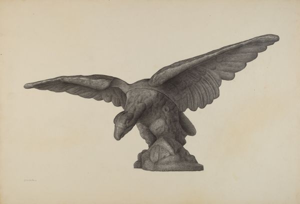 Editor: Here we have John Davis's "Eagle," likely created sometime between 1935 and 1942, a striking depiction rendered with watercolor and colored pencil. There’s something so immediate and imposing about it, isn't there? It practically demands attention! How do you interpret this work? Curator: Ah, yes, "Eagle." It's funny, you know, when I first saw it, I felt like I was glimpsing a dream about America. It almost seems like it's meant to be an emblem, strong and stoic. But, there’s this almost wistful fragility too, perhaps that's a reflection of the period in which it was created, right? Those years were pretty turbulent in America, coming out of the Depression… Editor: That's really insightful! I hadn't thought of the Depression era context. What about the technique? It seems almost hyper-realistic at some points. Curator: Indeed! Davis definitely possessed considerable skill. Notice how he uses watercolor washes to capture the softer plumage but employs coloured pencil for intricate details, especially in the wings. It seems like the artist saw something worth enshrining in this depiction of the animal; do you see any symbolism at play, there? Perhaps even cultural critique embedded within that representation? Editor: I do. Perhaps it embodies freedom but also, caged, or constrained by the medium or circumstance...It really shows the mastery the artist held. Curator: Yes, precisely. It is quite intriguing how layers can add so much depth to an otherwise common subject. Editor: Thanks, that made me look at it with fresh eyes! I'll never see an eagle the same way. Curator: Wonderful. Keep seeking hidden depths, my friend, for art truly reveals itself in those subtle whispers.