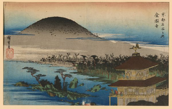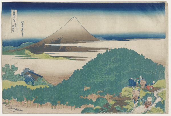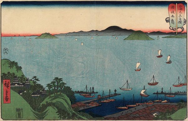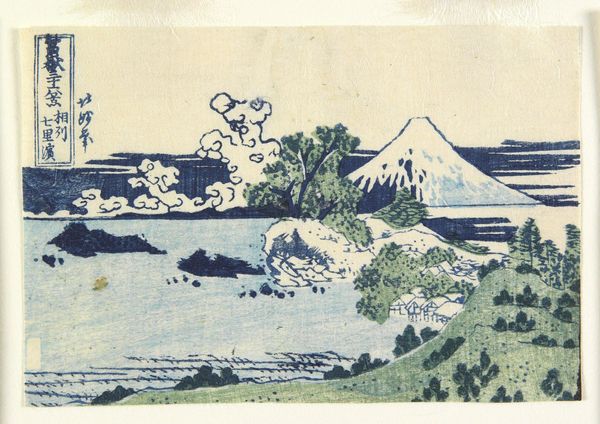 Curator: We’re standing before "Mt. Unzen," a striking woodblock print created in 1936 by Unichi Hiratsuka. Editor: Ah, there’s something about it that’s immediately soothing. It’s minimalist, almost elemental in its shapes and colours. And the way those horizontal water ripples catch the light--truly sublime. Curator: Indeed. The ukiyo-e influence is very apparent. Look at the simplified forms—the almost block-like representation of the houses against the mountain range. There’s a very deliberate organization here. The composition directs the eye in layers: water, then shore, up to the mountains, and finally the sky. Editor: It’s clever, how Hiratsuka plays with the horizon line. The line cuts across, yet each horizontal division—water, land, sky—presents us with a distinct emotional texture. Like memories of distinct days along the same coast. Curator: You’ve intuited one of the most compelling qualities of this print, and of ukiyo-e generally—how they distill lived experience into essential, elegant forms. The use of woodblock printing enhances this effect, creating a tactile texture within a serene image. Notice how the application of colours contributes to a unique depth—even within such a simplified style. Editor: Almost like the image becomes about more than just looking at the view but feeling its resonance, its place in time and memory. Curator: Precisely. It engages not merely our sight, but our understanding of how form shapes our world. A compelling harmony between idea and execution, if you will. Editor: Yes, a very successful meditation on space. I wonder how that lone boat floating within those cool waters interprets its place within the whole landscape…It almost looks trapped between two conflicting emotions: the warm coast, the blue ocean…It seems both exposed and shielded, maybe representing the fleeting present as we view it! Curator: A most stimulating interpretation. I hadn't considered the boat as a metaphor... Editor: Thanks. Well, for me, the experience shifted, and a certain quiet reflection bloomed.