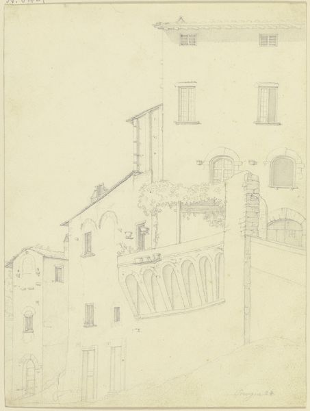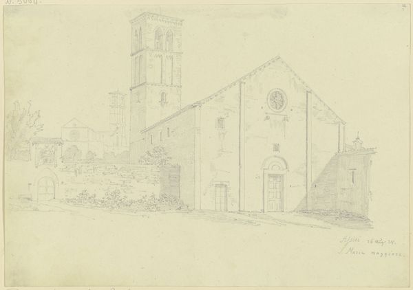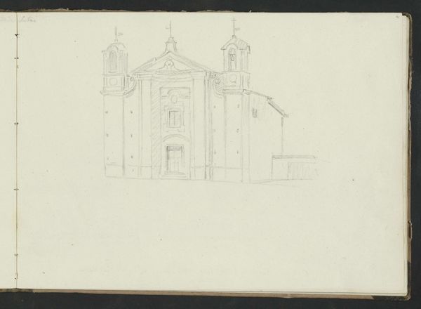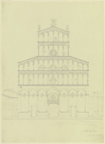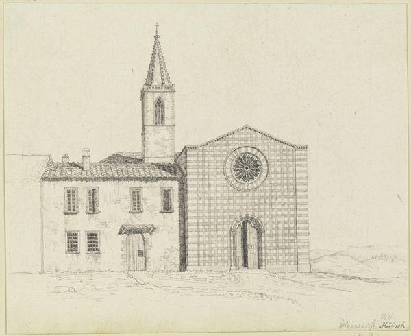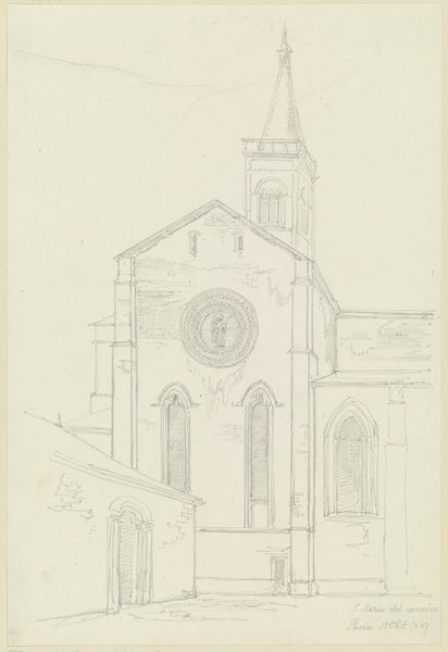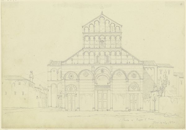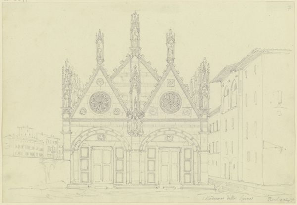 Editor: This is Friedrich Maximilian Hessemer's pencil drawing, "S. Francesco d’Assisi in Palermo," likely from 1829. It's a meticulously rendered architectural study, and I'm struck by its almost dreamlike quality. What draws your eye when you look at this piece? Curator: The ghostliness, actually! Hessemer's captured more than just the stone and mortar. Doesn't it feel like a whisper from the past? A memory etched lightly on the page? And consider Palermo in 1829 – a cultural crossroads, simmering with history. This drawing isn’t just of a church; it’s of a specific time and place, filtered through Hessemer’s own lens. Do you see the Neoclassical elements clashing ever so slightly with the… almost playful Gothic detailing? Editor: I do. There’s something slightly off-kilter, a tension between styles. So, is he just documenting what he sees, or is there something more personal going on? Curator: Ah, there's always more, isn’t there? I feel Hessemer is less concerned with precise replication and more interested in capturing the feeling, the essence, of this space. Maybe he was drawn to that very tension, that mingling of past and present that the building embodies. Art is, after all, not a mirror, but a mind. It allows us to travel… imagine him standing there, pencil in hand, absorbing the Sicilian sun. It really is like visual time travel, don’t you think? Editor: I think I agree. Seeing the architecture contextualized this way, almost as a cultural artifact instead of *just* a building, really makes you think about how much a piece like this can communicate. Curator: Exactly. It’s a dialogue, not a monologue. We bring ourselves, our own histories, to meet Hessemer’s history, captured in pencil. Hopefully a little magic transpires in that meeting.
