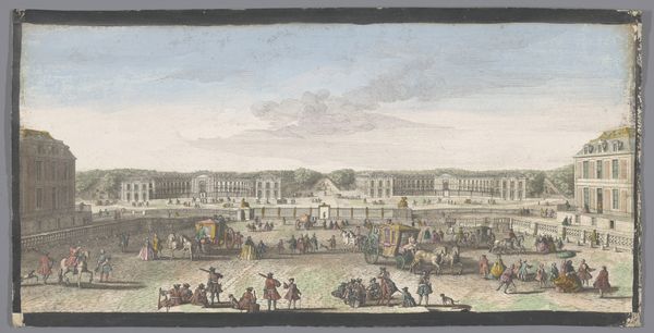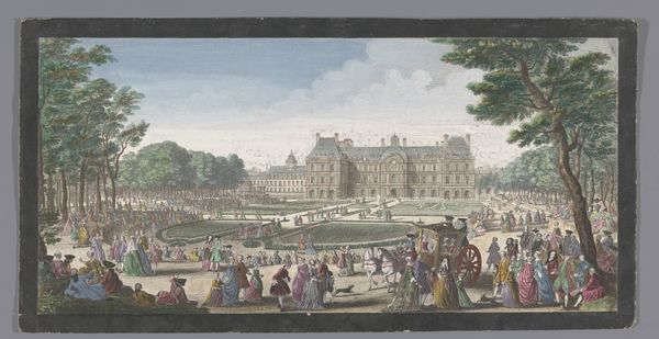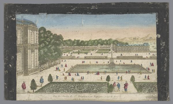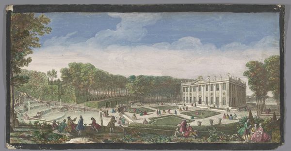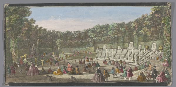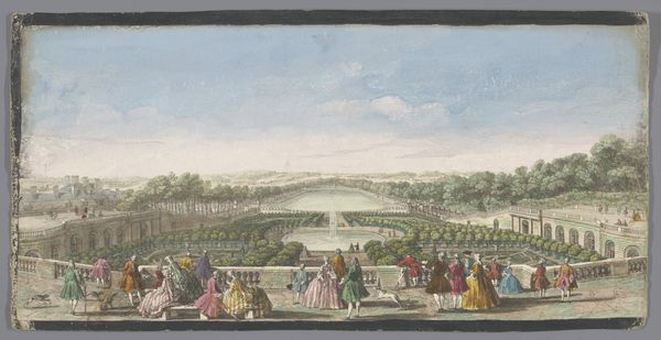 Editor: Here we have an 18th-century watercolor painting, "Gezicht op het Bassin de Latone in de Tuin van Versailles," from an anonymous artist in the Rijksmuseum collection. It's quite lovely. I am struck by the order, and almost theatrical, arrangement of the gardens and people. What’s your read on this scene? Curator: The scene represents more than just aesthetic preferences; it is a visual statement of power, control, and the strict social hierarchy that defined the era. The geometric perfection of the garden is, in itself, an assertion of human dominance over nature, mirroring the monarchy's dominion over its subjects. How do you see the figures fitting into this landscape? Editor: They seem like actors in a play, dressed to impress and conscious of their role within the court, each conforming to expectations, to gender roles, and even fashion trends. Curator: Precisely. Versailles was not just a palace but a carefully constructed stage for performing power. Notice how the fountain, a celebration of mythological power with Latona protecting her children, takes center stage. Can you see a possible critique in the artist's interpretation of this grand display? Is it simply a celebratory rendering, or could it subtly question the extravagance? Editor: I suppose it could be both. Perhaps the artist is neutrally documenting the lavish lifestyle, subtly inviting viewers to question its equity when considering broader social disparities. Or maybe this perspective is simply a 21st-century reading? Curator: Exactly! Our contemporary lens encourages such questions. By examining the work through feminist and class-conscious perspectives, we unveil complex dialogues about representation, privilege, and the unspoken stories of those excluded from this manicured paradise. It really underlines how much context shapes artistic intention and, more importantly, shapes our individual understandings. Editor: I now realize I had viewed the painting in a rather one-dimensional way, mostly drawn by the composition. You've helped me to view the gardens as an embodiment of cultural structures of power.
