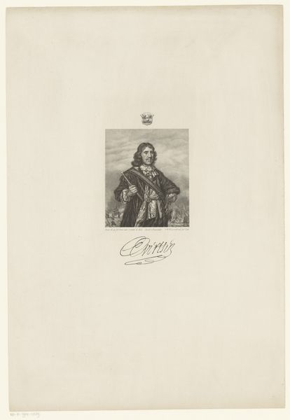 This is Frederik Hendrik Weissenbruch’s monochromatic print of Johan Evertsen, medium unknown. The portrait’s composition is structured by contrasting textures and values, rendering a striking image. The subject, Johan Evertsen, a Dutch admiral, is depicted with meticulous detail. Weissenbruch masterfully manipulates light and shadow to model Evertsen's features, imbuing the portrait with a sense of depth and presence. The artist’s formal strategy highlights a tension between the individual and the broader historical narrative. Evertsen stands as a symbol of Dutch maritime power, his representation reflecting both personal identity and national pride. Note how the carefully placed signature emphasizes the importance of authorship and identity. Weissenbruch uses this to engage with questions of representation, authenticity, and historical memory. The print invites us to consider the complex interplay between the individual, the artist, and the larger cultural forces that shape our understanding of history.