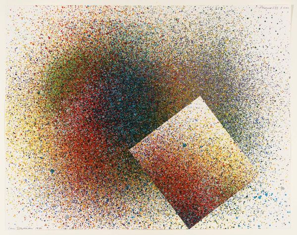 Curator: Sam Francis's "Concert Hall I," held in the Tate Collections, offers an intriguing visual experience through its interplay of color and form. Editor: It feels like a deconstructed stage, doesn't it? The dark squares framing a chaotic burst of color evokes a sense of confinement and pent-up energy. Curator: Absolutely. The concentric squares resonate with the symbolic weight of centering, a kind of cosmic organization disrupted by the vibrant splatters. It echoes the idea of sacred architecture but with a raw, unfiltered energy. Editor: I see it as a commentary on institutional spaces, perhaps even a critique. The rigid structure attempts to contain the fluidity of expression, the vibrant splatters representing marginalized voices pushing against oppressive frameworks. Curator: Perhaps. Francis's work often taps into universal archetypes; the concert hall as a symbol of community and shared experience, but also potentially of control and imposed order. Editor: Precisely. It is a powerful reminder that spaces of gathering are never neutral. Curator: Indeed, a visual symbol that continues to spark diverse interpretations. Editor: A potent reminder of the complexities inherent in communal spaces.